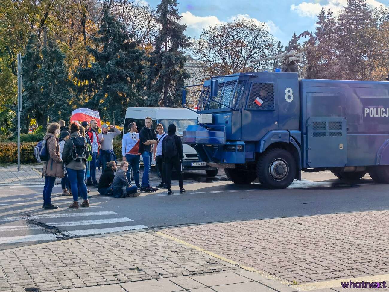 Liczba funkcjonariuszy zebranych wokół protestujących przekracza wszelkie pojęcie. Spróbuję Wam to zobrazować. Cały Plac Defilad otoczony przez policyjne furgonetki. Kolejne ustawione wzdłuż Pałacu Kultury w stronę Dworca Centralnego, na prawie całej długości Marszałkowskiej wzdłuż PKiN oraz kolejne od Al. Jerozolimskich. Nie wspominając już o tych, które na bieżąco dojeżdżały i krążyły za grupami protestujących. Kiedy zaczęło robić się gorąco, pojawiły się też dwie armatki wodne.