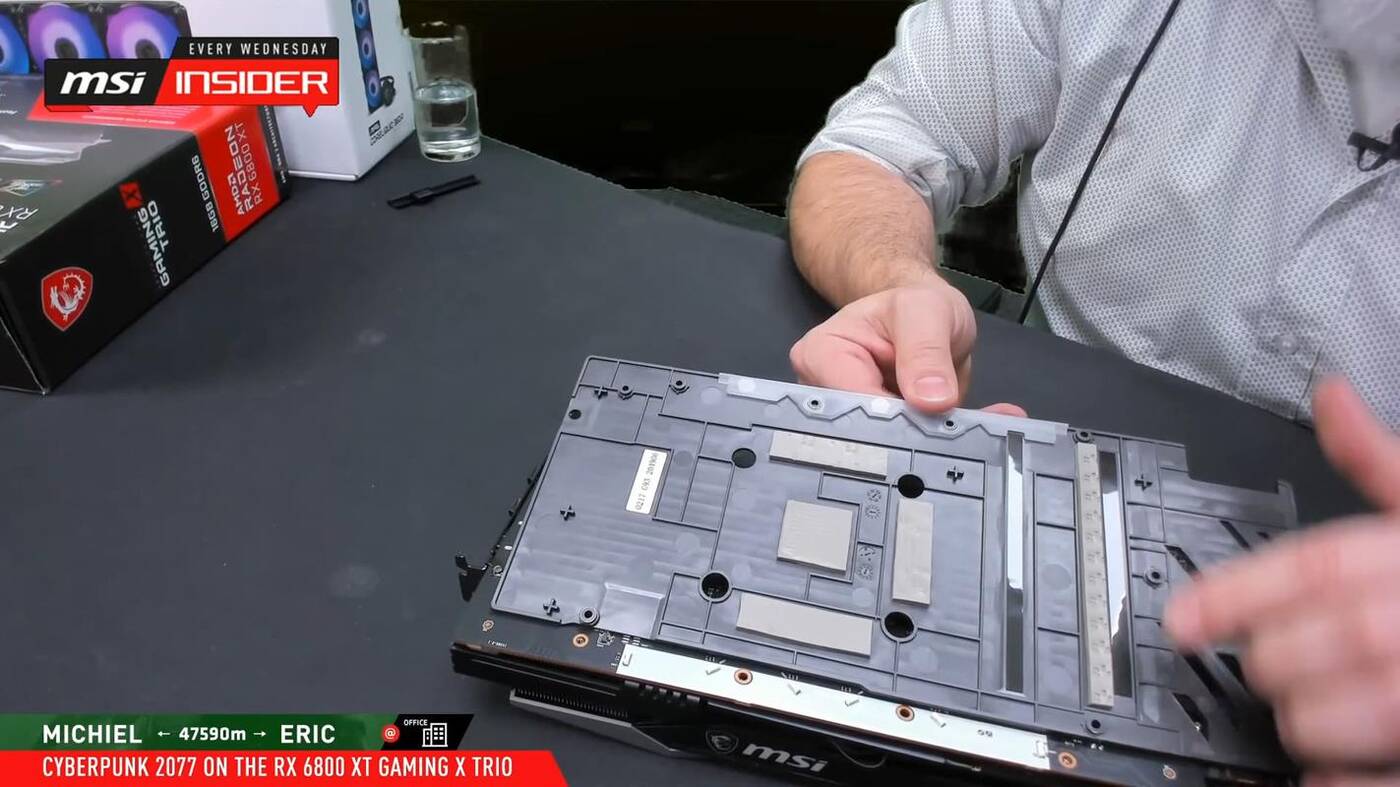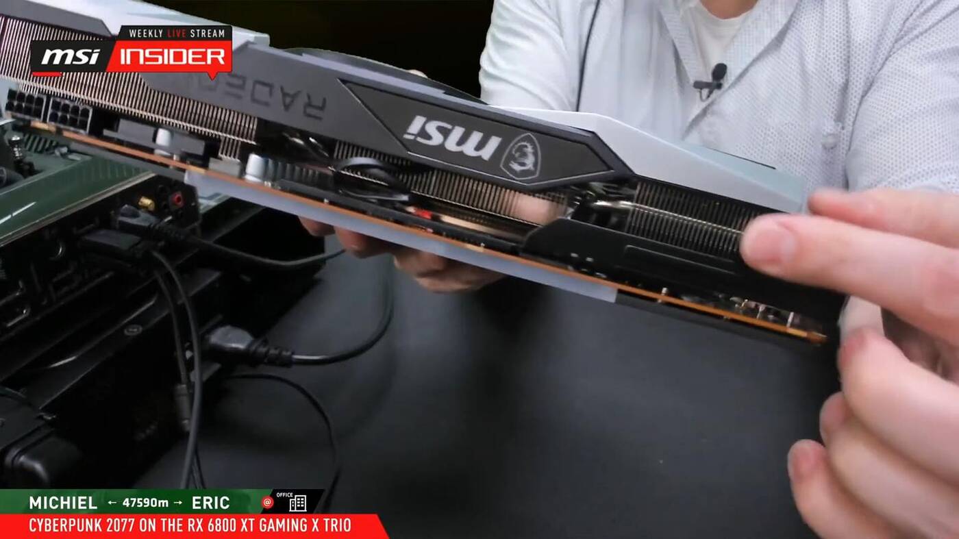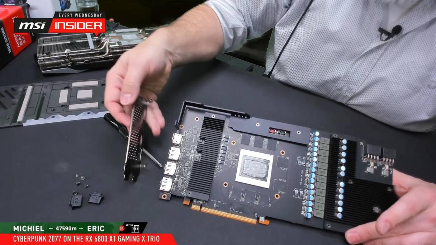 Głównym bohaterem transmisji był więc Radeon RX 6800 XT GAMING X TRIO. To całkowicie niestandardowy projekt oparty na GPU Navi 21 XT, który posiada chłodzenie z trzema wentylatorami, które wydaje się zajmować 2,7 gniazda PCIe.