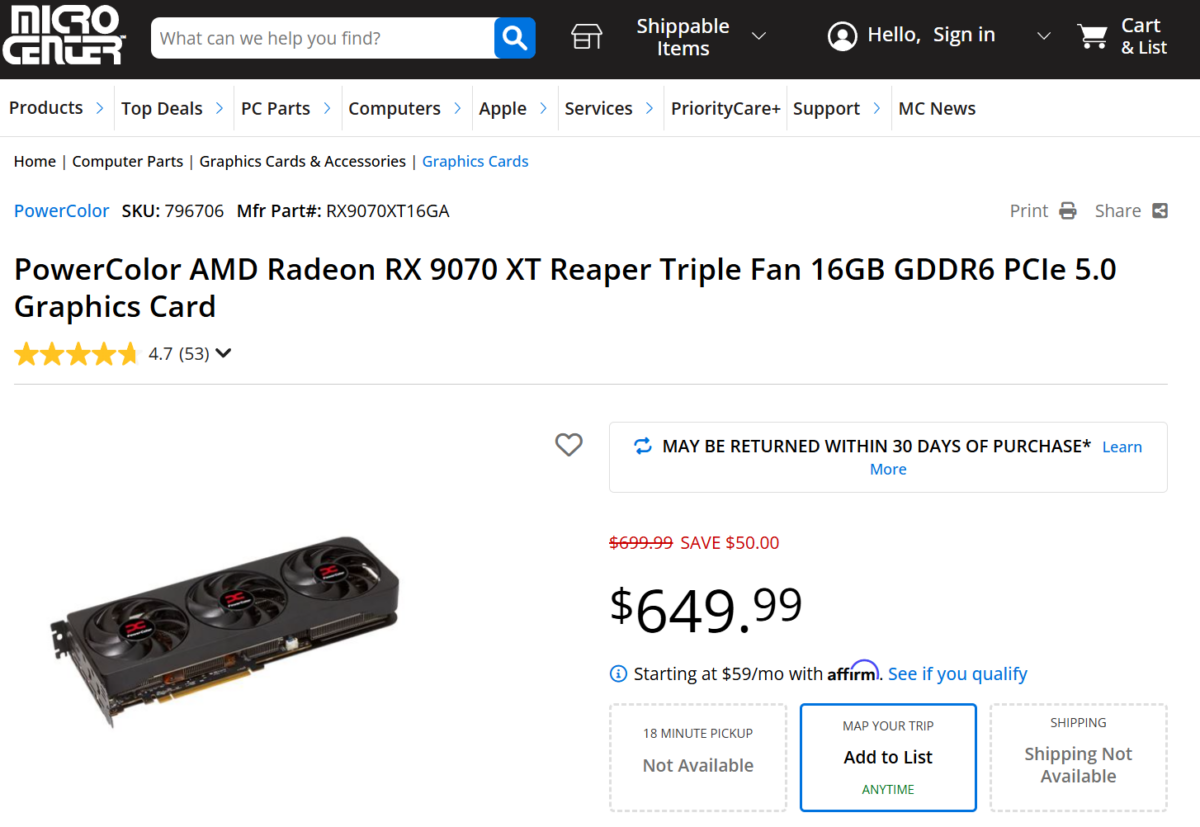 Pojawił się jednak drobny sygnał zmian. MicroCenter, oficjalny partner premierowy, wprowadził do oferty PowerColor Reaper RX 9070 XT w cenie 599 USD, czyli dokładnie na poziomie MSRP. Niestety, promocja ma dwa ograniczenia – dotyczy wyłącznie odbioru osobistego w sklepach, a sama sieć nie odzwierciedla realiów całego rynku, bo to właśnie MicroCenter otrzymał większość początkowej puli kart.