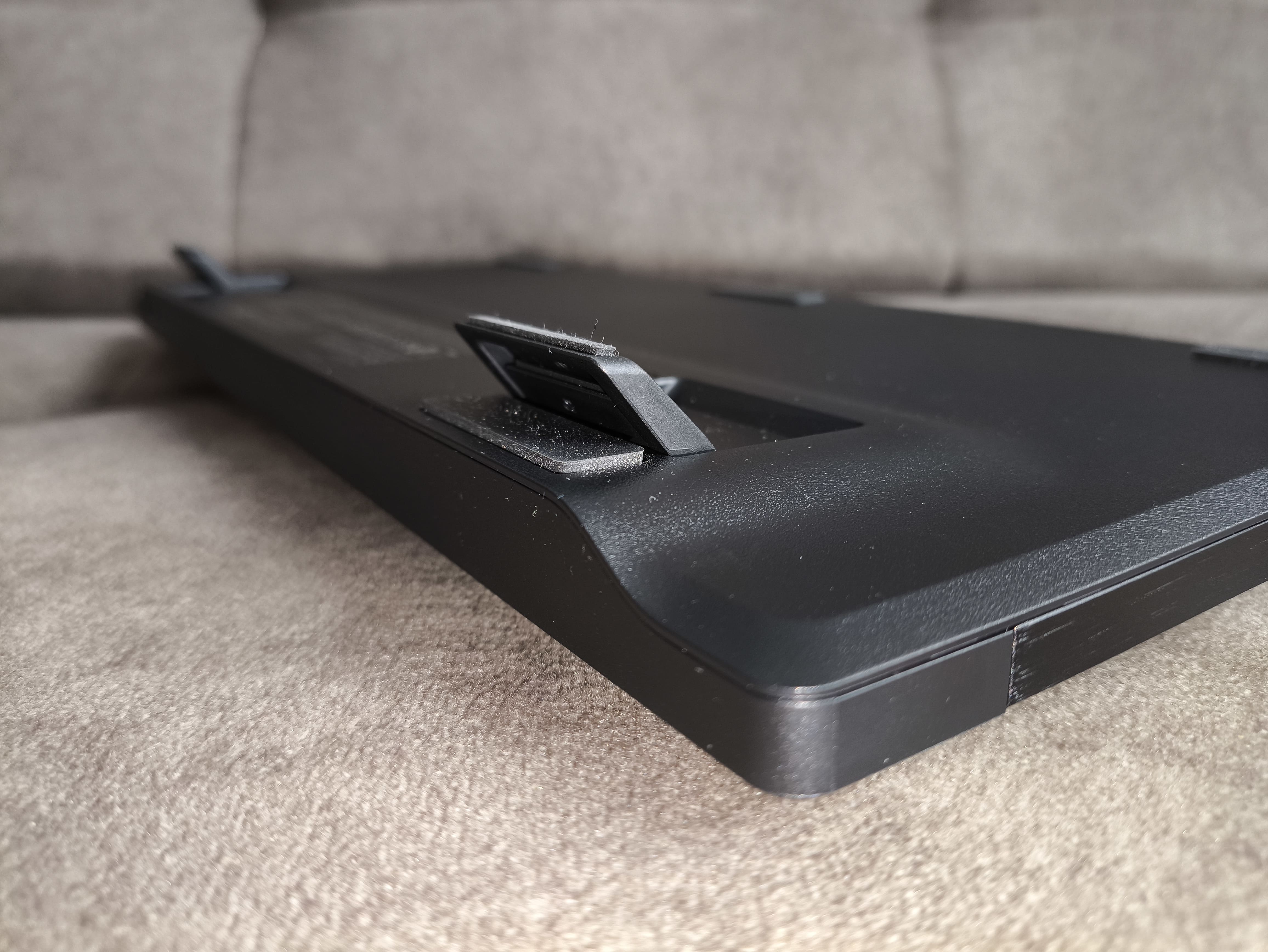 Dla użytkowników preferujących lekko nachyloną powierzchnię, klawiatura posiada dwustopniowe nóżki, które pozwalają ustawić klawiaturę pod kątem 6° lub 9°. Mechanizm podnóżek jest solidny, a same nóżki blokują się pewnie w wybranej pozycji, eliminując ryzyko przypadkowego złożenia podczas użytkowania.