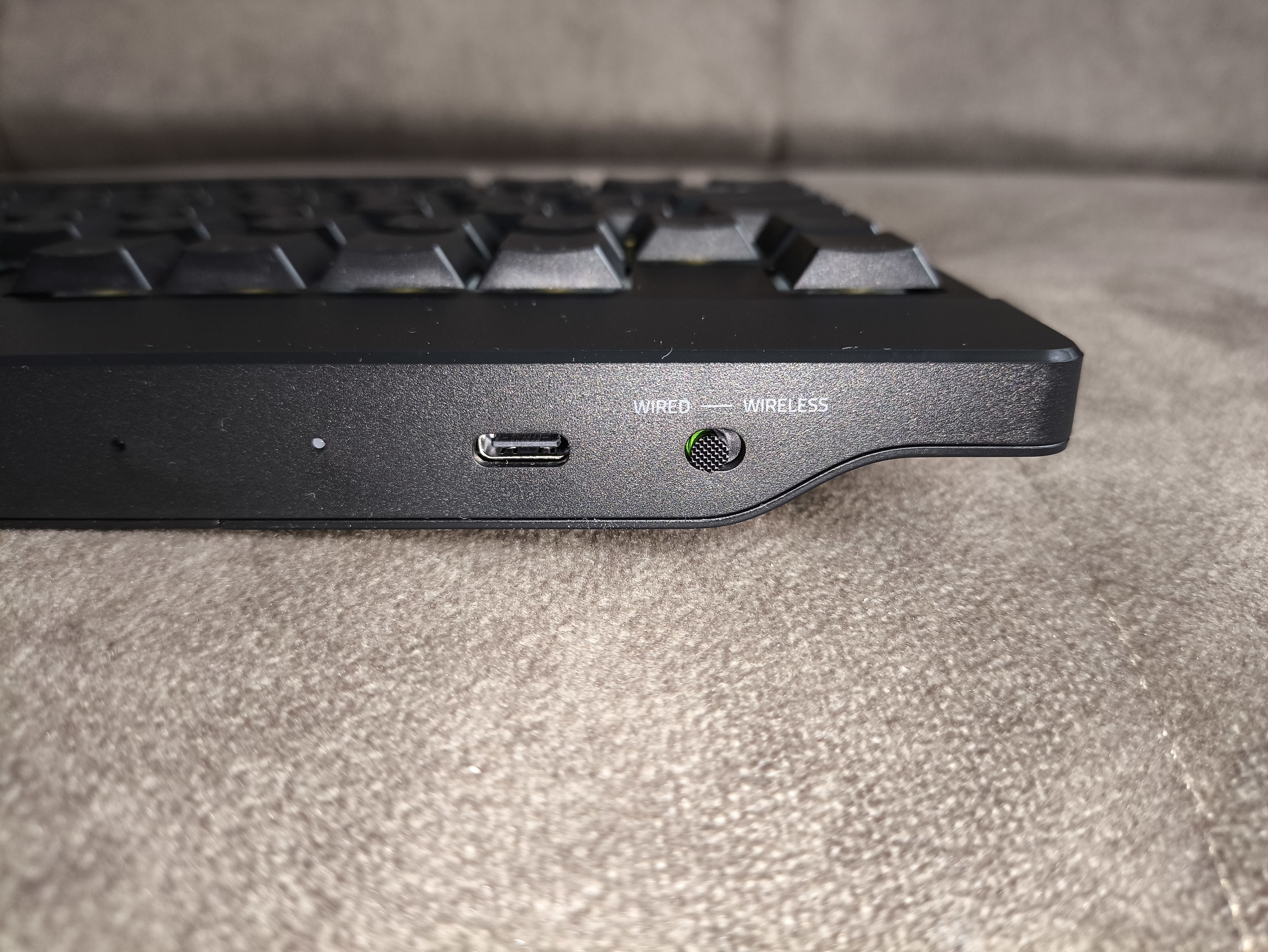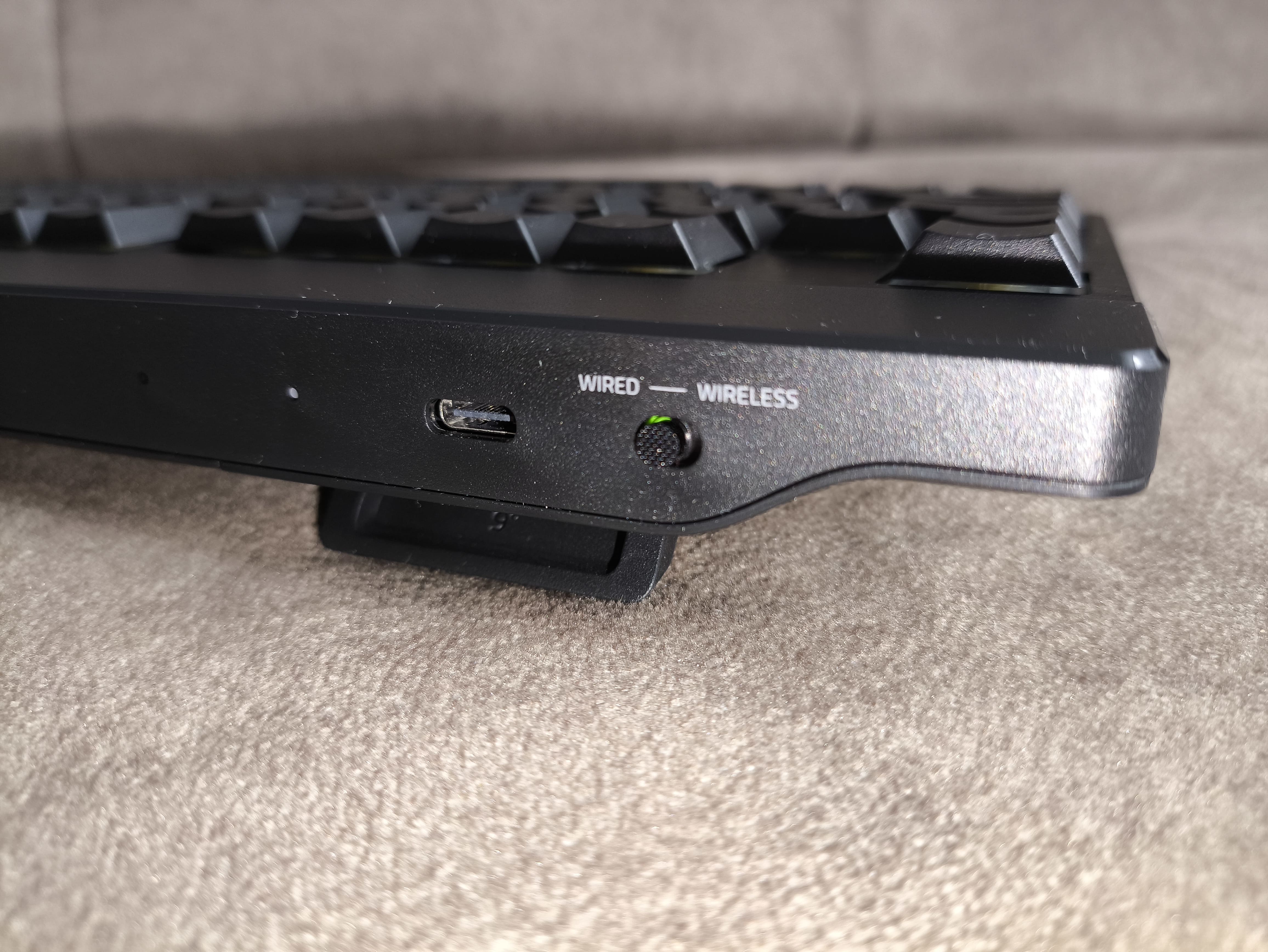 Na tylnej krawędzi klawiatury znajduje się przełącznik umożliwiający zmianę trybu pracy między przewodowym a bezprzewodowym. Dzięki temu możemy błyskawicznie dopasować sposób połączenia do aktualnych potrzeb, a w razie konieczności szybkie sparowanie z donglem 2.4 GHz odbywa się poprzez dedykowaną kombinację klawiszy.