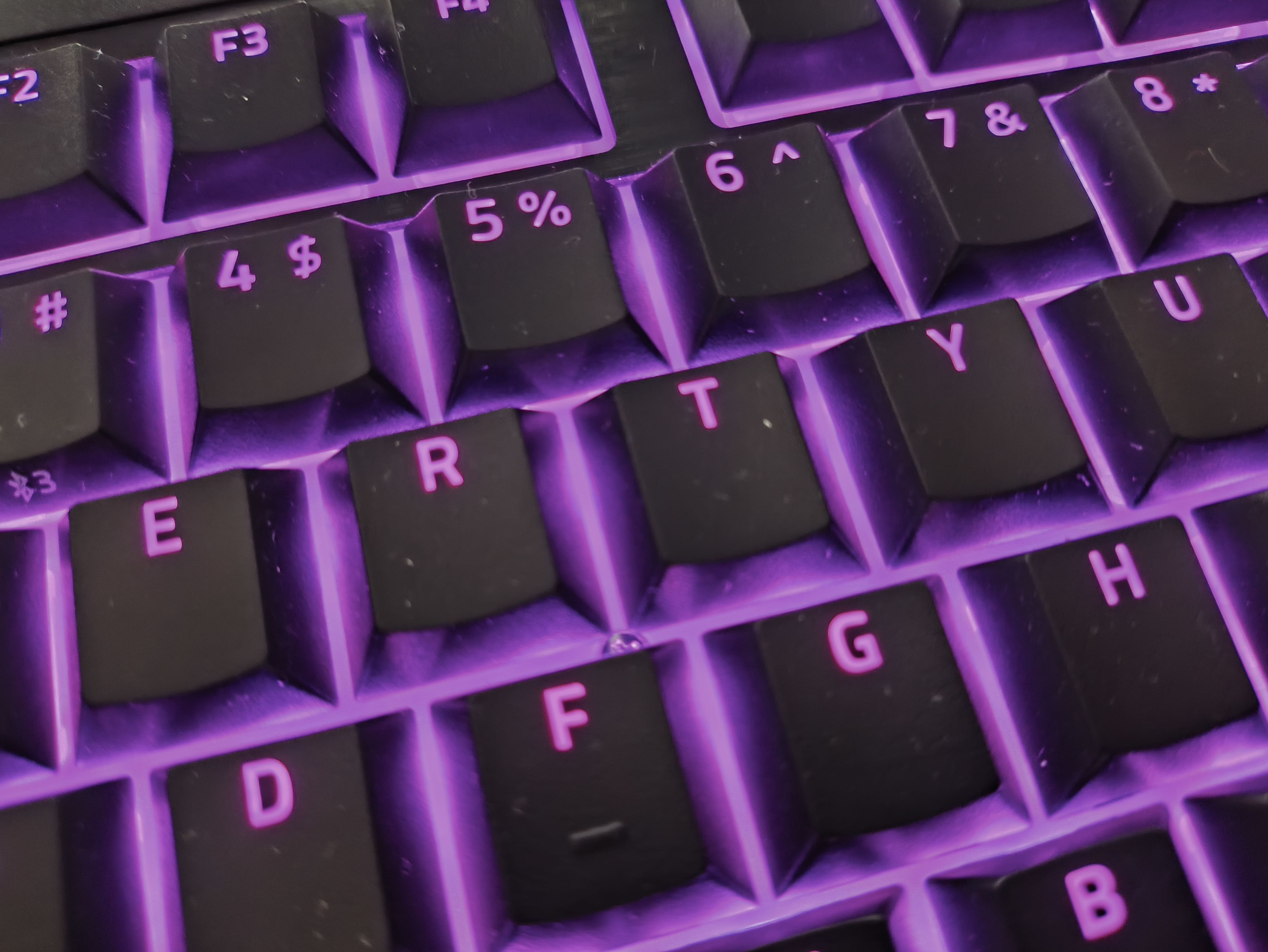 Światło przenika przez keycapsy PBT równomiernie, dzięki czemu litery i symbole są dobrze widoczne nawet w warunkach słabego oświetlenia.