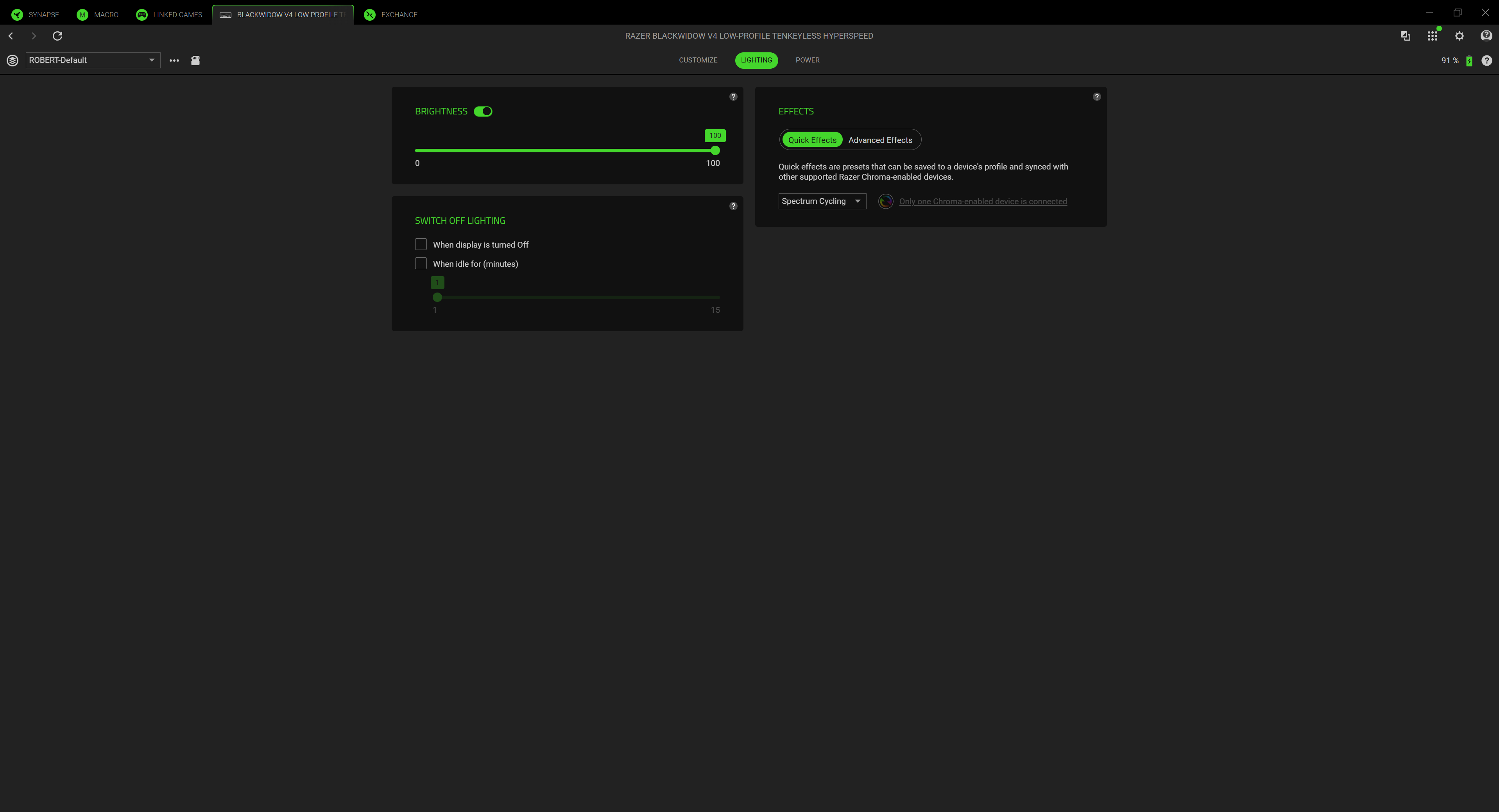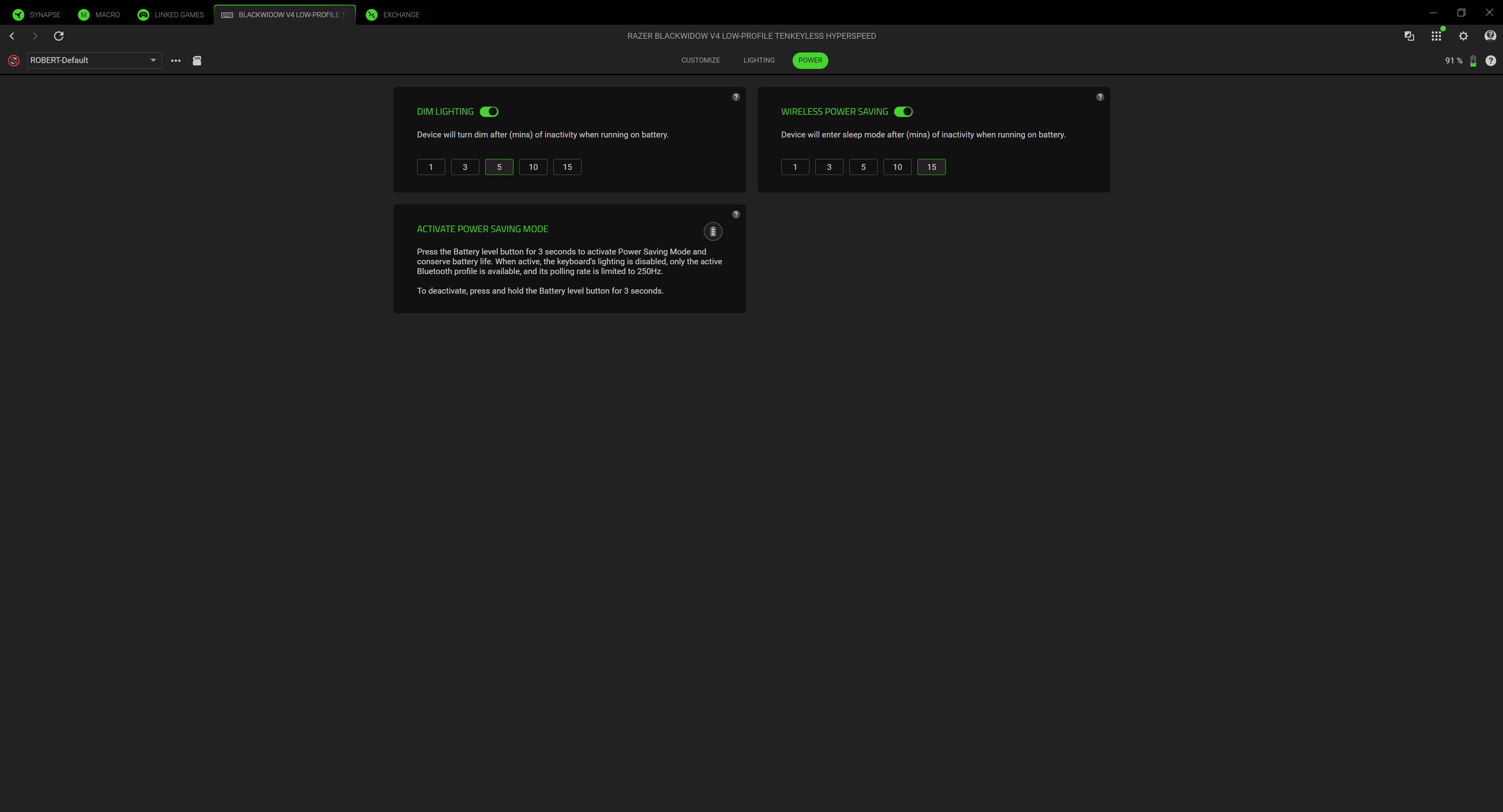 Razer BlackWidow V4 Low-Profile Tenkeyless HyperSpeed korzysta z autorskiego oprogramowania Razer Synapse 4, które umożliwia pełną konfigurację klawiatury i jej funkcji zarówno w trybie przewodowym, jak i bezprzewodowym. Synapse dzieli opcje na trzy główne zakładki: Customize, Lighting oraz Power (oszczędzanie energii).