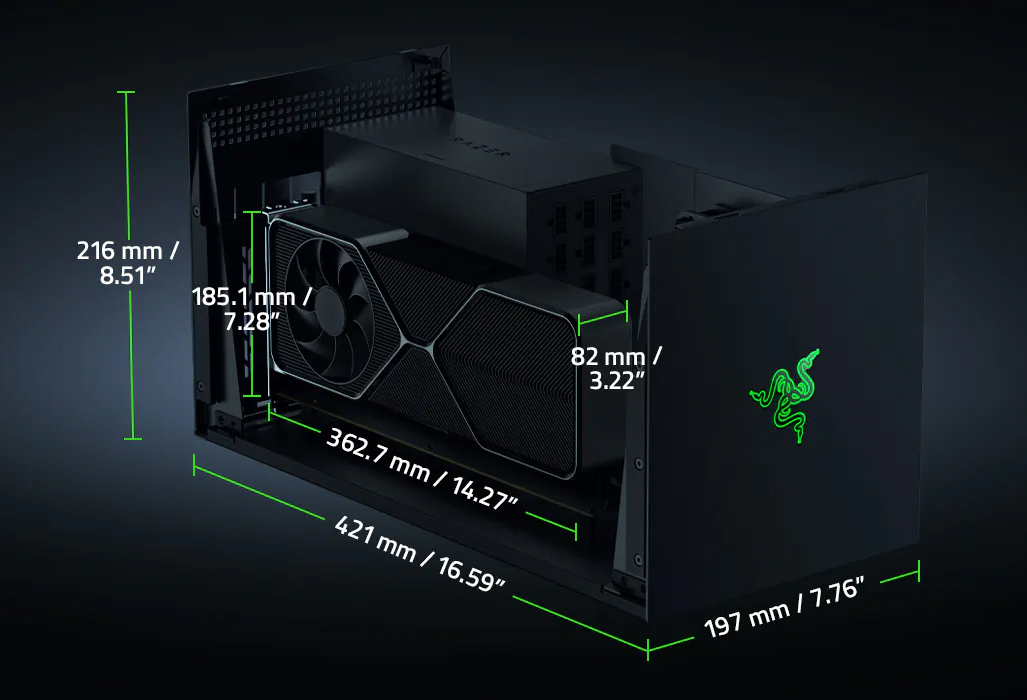 Obudowa obsługuje teraz większe karty graficzne – nawet do 4 slotów. Kompatybilność obejmuje zarówno układy NVIDIA, jak i AMD, choć ograniczenie PCIe 4.0 x4 może wpłynąć na wydajność flagowych GPU. Tym razem Razer nie podaje oficjalnego wsparcia dla macOS.