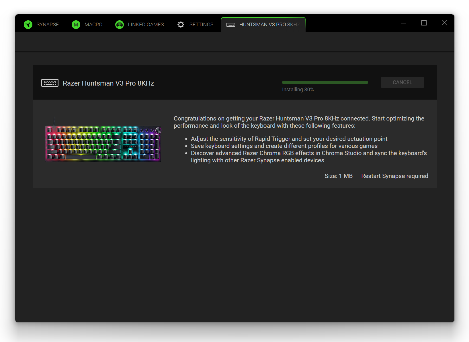Pełnię możliwości Razer Huntsman V3 Pro 8KHz odblokowuje dopiero oprogramowanie Razer Synapse 4. Klawiatura oferuje co prawda podstawową regulację „z poziomu sprzętu” (skrótami klawiszowymi), jednak realna precyzja konfiguracji – szczególnie w zakresie aktywacji, Rapid Trigger czy przypisywania funkcji – wymaga instalacji aplikacji producenta.