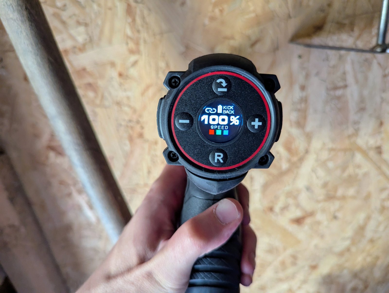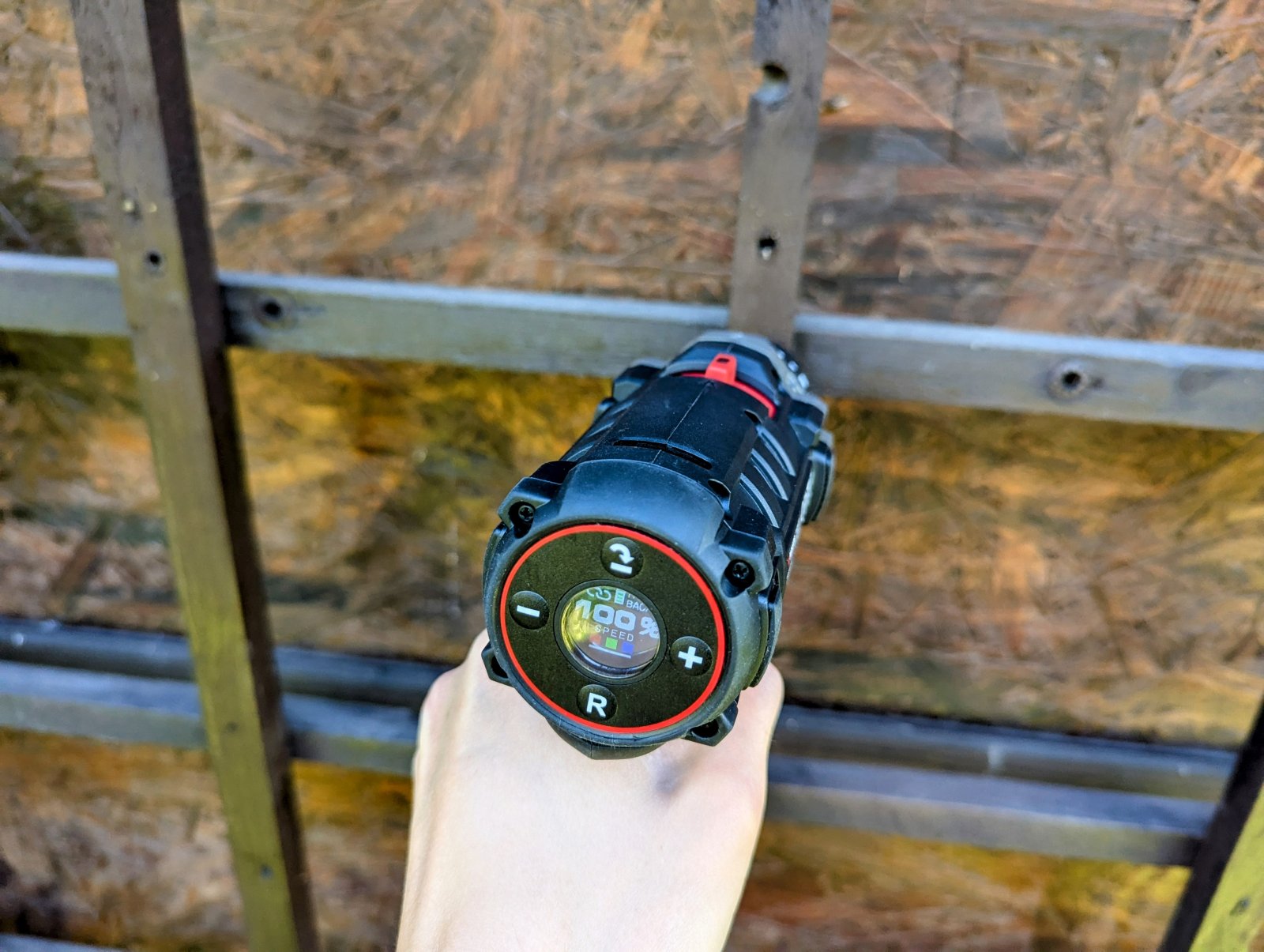 Wiertarko-wkrętarka wyposażona jest w lampę roboczą LED oraz dodatkowe, konfigurowalne podświetlenie RGB. Co ciekawe, światło można regulować z poziomu aplikacji. Lampka dobrze doświetla obszar pracy, a barwa RGB pełni raczej funkcję pomocniczą i informacyjną (np. zmiana koloru w zależności od trybu pracy). Nowością w tej klasie urządzeń jest kolorowy wyświetlacz LCD – umieszczony w górnej części obudowy. Pokazuje on m.in. stan akumulatora i aktualne ustawienia momentu obrotowego. To przydatne rozwiązanie, zwłaszcza gdy przełączamy się między materiałami o różnej twardości – można na bieżąco kontrolować i modyfikować parametry bez zgadywania.