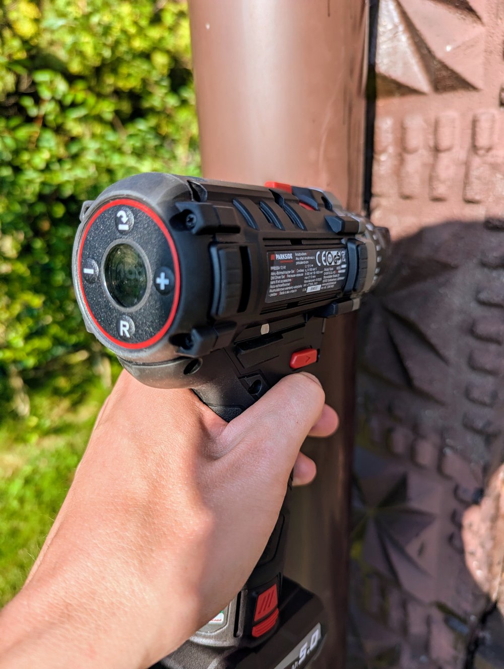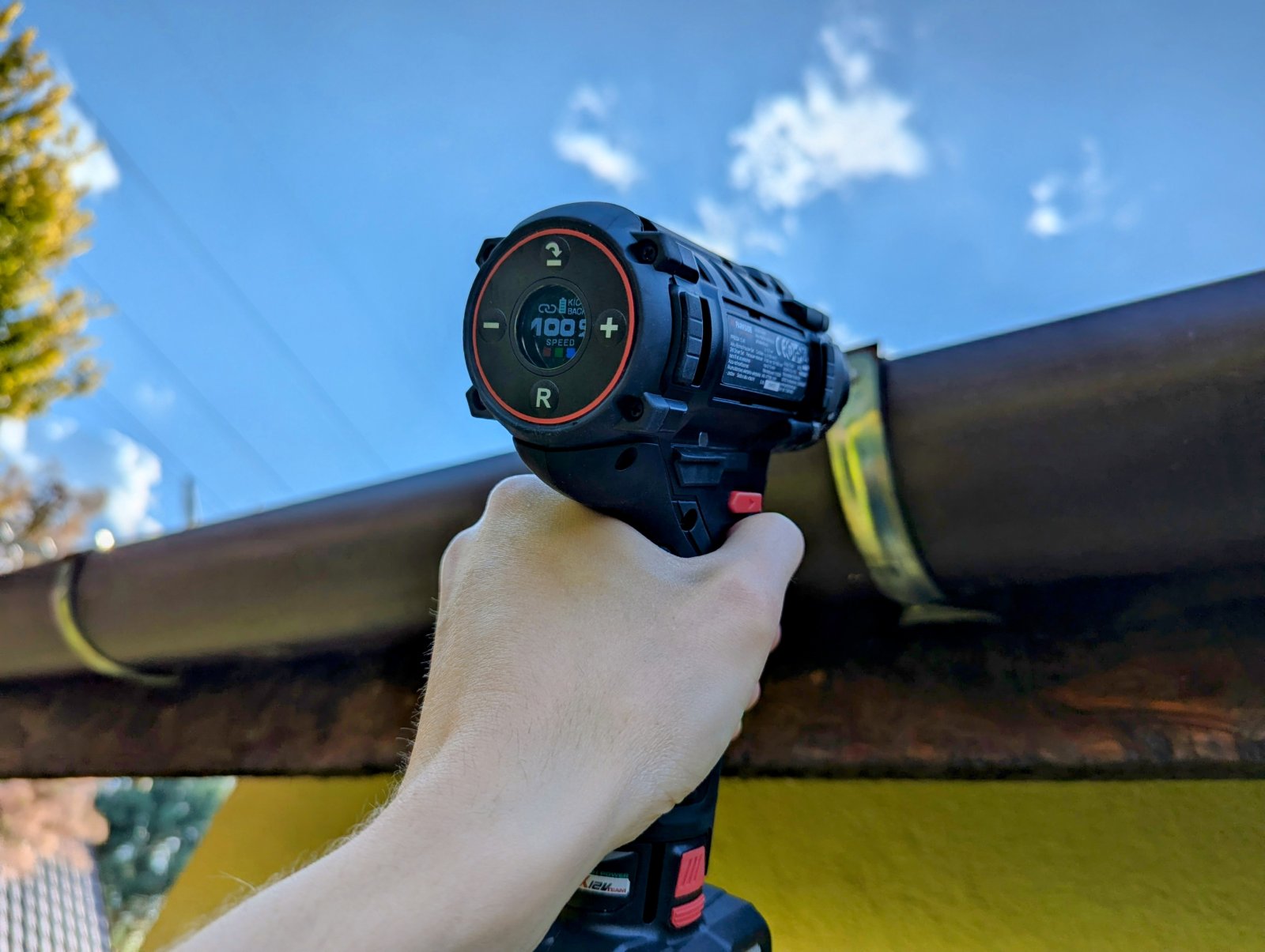 - Praca z dala od gniazdka. Długi czas pracy to jedna z największych zalet tego modelu. Akumulator o pojemności 5 Ah w połączeniu z energooszczędnym silnikiem bezszczotkowym pozwala na wiele godzin działania bez konieczności ładowania – co ma kluczowe znaczenie, jeśli działka nie ma stałego dostępu do prądu. Nawet przy intensywnym wierceniu w grubych belkach akumulator nie rozładowuje się gwałtownie, a wyświetlacz LCD daje dokładną informację o jego stanie.