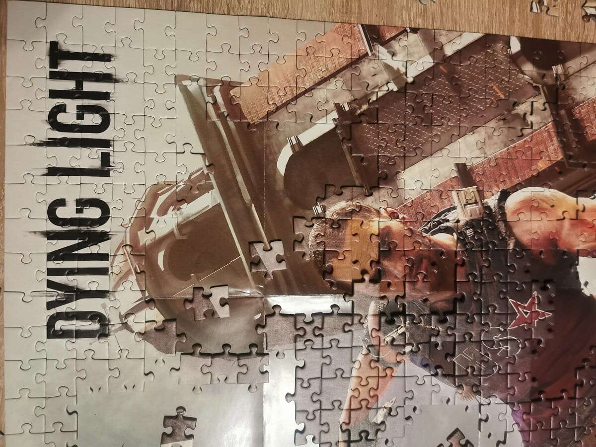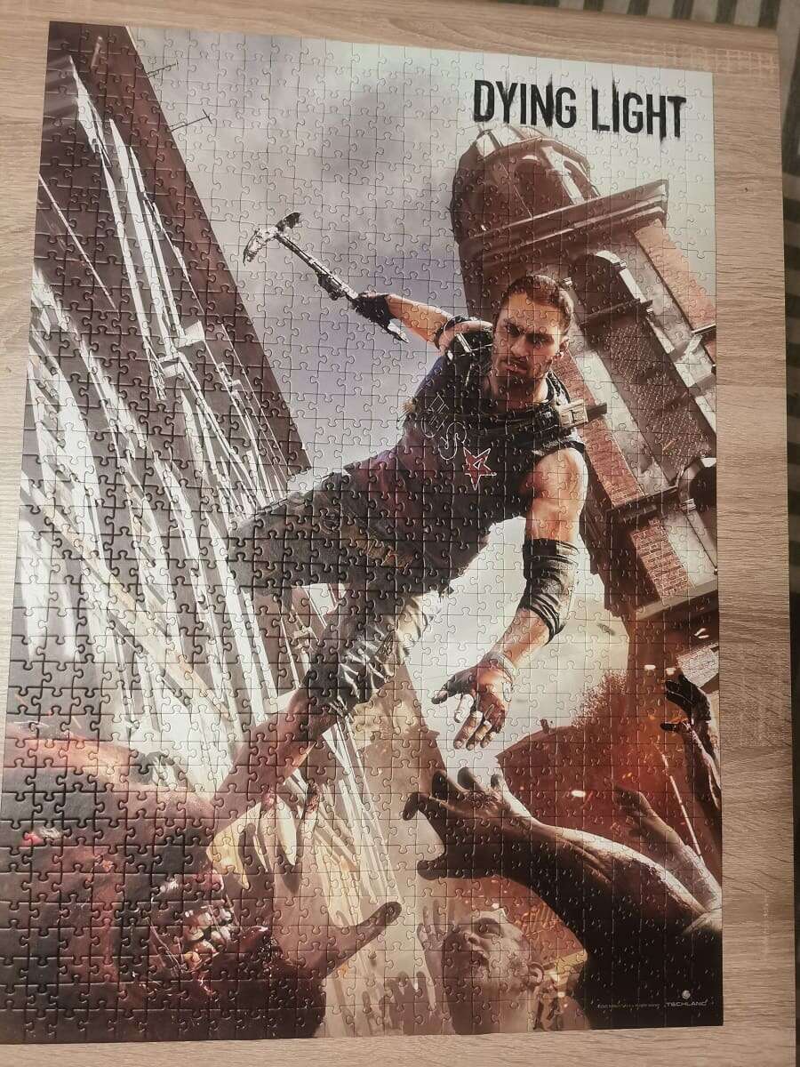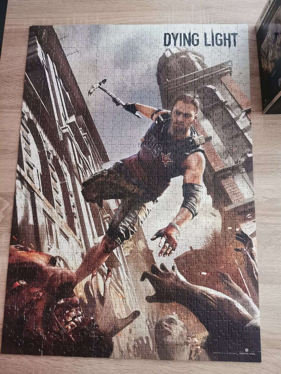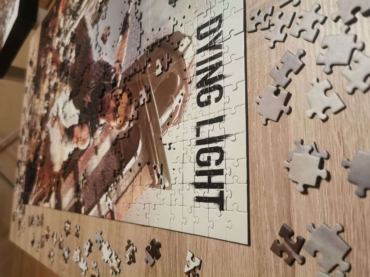Od razu zaznaczę, że nie mam zbytniej wprawy w układaniu puzzli. Nie robiłam tego od lat, więc z pewnością zajęło mi to więcej czasu niż osobie, która zajmuje się tym częściej. Przyjmijmy więc, że mój poziom jest bardzo początkujący. Puzzle z Diyng Light układałam około 12 godzin, ale nie bez przerwy. Wzór jest dość wymagający, głownie z powodu elementów z bardzo podobnym do siebie nadrukiem. Wiadomo, niebo jak zawsze problematyczne, ale mamy tu również inne fragmenty, które trochę przysparzają problemów. Mówię tutaj na swoim przykładzie, bo zapewne puzzlowi wyjadacze zrobią to w mgnieniu oka. Akurat grafika z Dying Light raczej nie spodoba się osobom początkującym, które chcą poukładać puzzle dla relaksu. Trochę ta grafika napsuła mi krwi. Po ułożeniu, głównie z powodu ciemnych kolorów, niektóre detale są słabo widoczne, jednak jeśli chcielibyśmy powiesić nasze dzieło na ścianie powinno prezentować się naprawdę dumnie. Choć trzeba się trochę przyjrzeć, by dostrzec, że Kyle Crane ma oczy.
