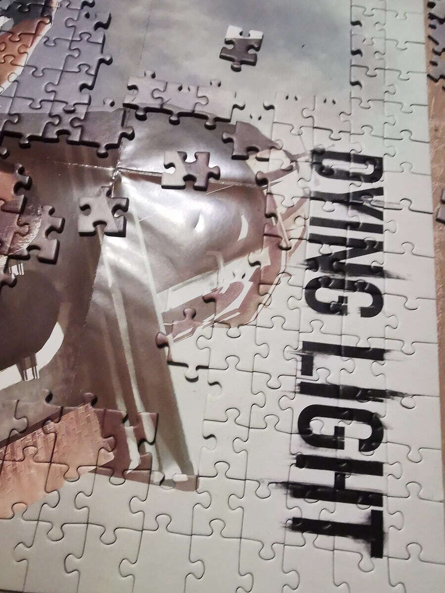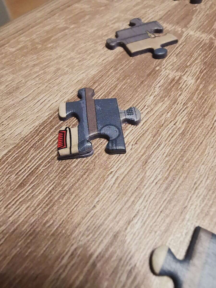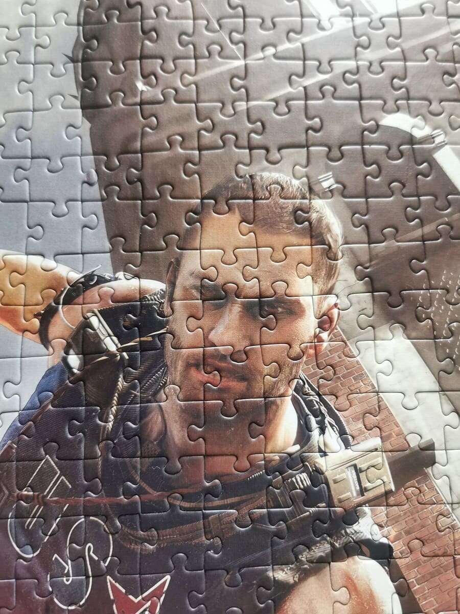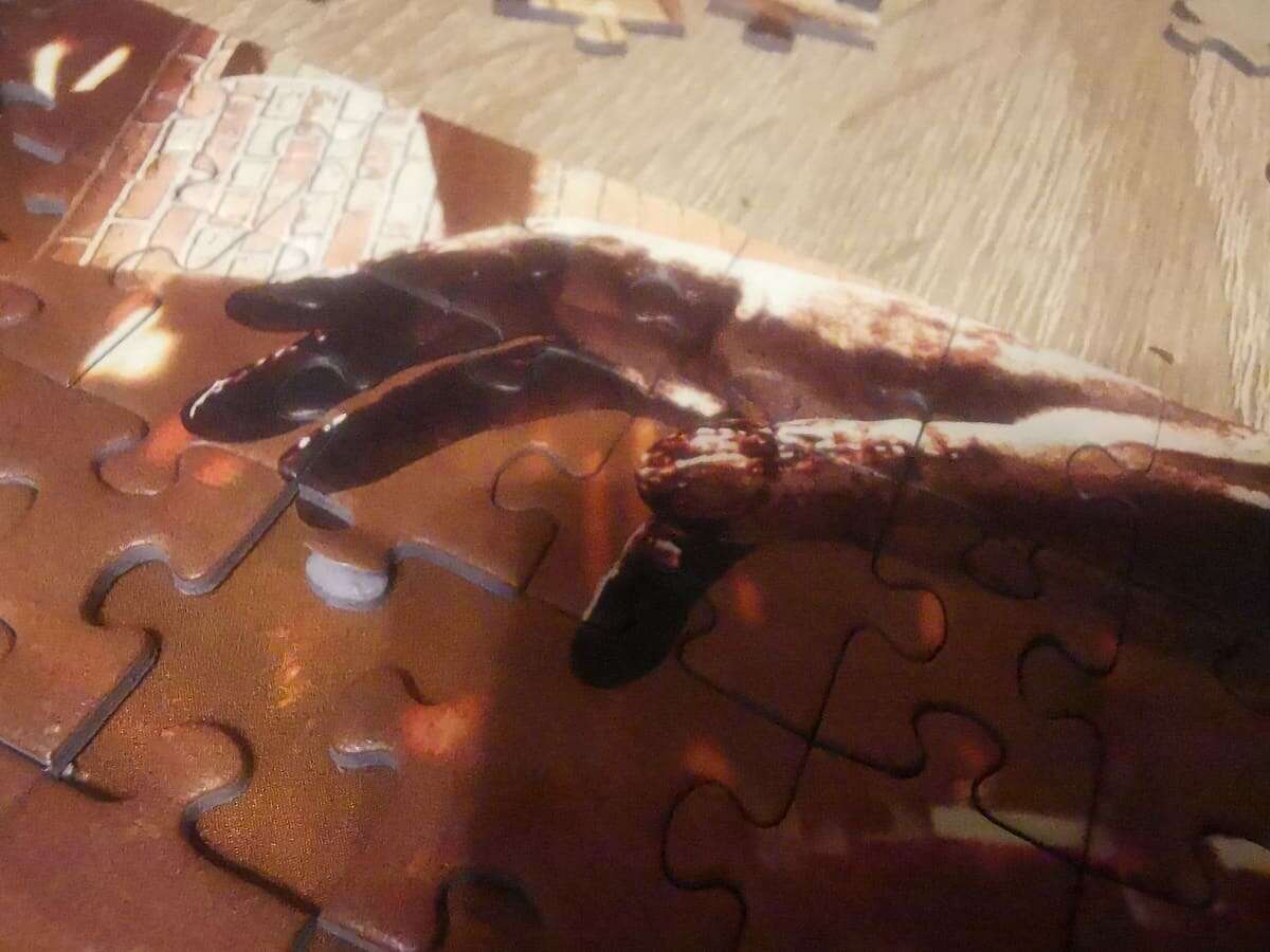 W obu pudełkach znalazło się sporo puzzli rozwarstwionych, a jeszcze nawet nie zdążyłam ich ułożyć. Niektóre uszkodzenia były malutkie, inne już trochę zaczynały odstawać w ułożonej układance. Na szczęście tylko jeden z puzzli był na tyle uszkodzony, by popsuć wygląd układanki, ale po lekkim podklejeniu wszystko wróciło do normy. Oprócz tych kilku defektów całość jest raczej na plus. Porządnie wykonana. Zastrzeżenia mogę mieć chyba tylko do nadruku ciemnych fragmentów grafiki. Detale są słabo widoczne nie tylko z odległości, ale również z bliska. Gdy układałam koszulkę Crane’a musiałam podkładać puzzle pod światło, by zobaczyć, czy to faktycznie kawałek ubrania, czy może zombiaka. Z kolei przy tych z Fallouta nie miałam najmniejszego problemu.