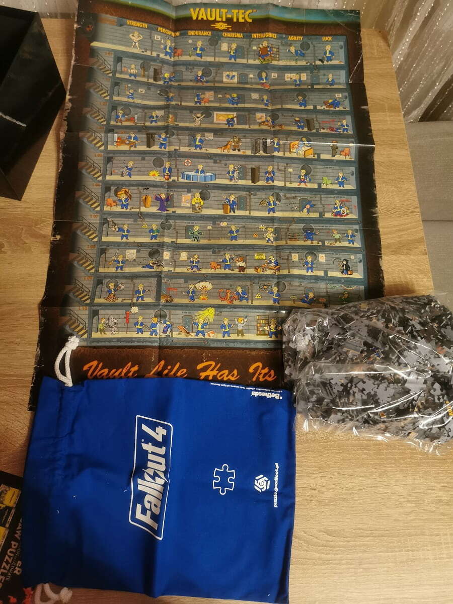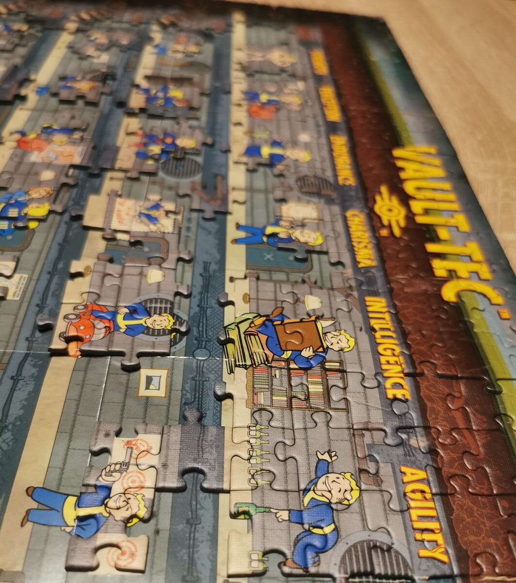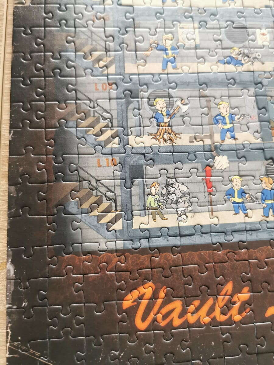 O wiele przyjemniejsze są już puzzle z Fallouta 4. Problematyczna w ich przypadku może być jedynie ramka, bo potem wszystko idzie bardzo szybko i sprawnie. To zasługa grafiki składającej się z wielu małych obrazków, bardzo łatwo szuka się poszczególnych elementów. No, oczywiście o ile całość składacie na dołączonym do puzzli plakacie. Dla mnie było to zdecydowanie łatwiejsze i przyjemniejsze. By ułożyć tę grafikę potrzebowałam około 4-5 godzin, choć przez połowę tego czasu miałam jeszcze dwóch pomocników. Zdecydowanie te puzzle bardziej nadają się do układania ze znajomymi, kiedy już przebrniemy przez ramkę i schody po lewej stronie można mieć sporo zabawy z poszukiwaniem poszczególnych wariantów Valut Boya. Jednak w tym przypadku po ułożeniu grafika z odległości jest niewyraźna, zbyt duża ilość detali sprawia, że z daleka po prostu niewiele dostrzeżemy.