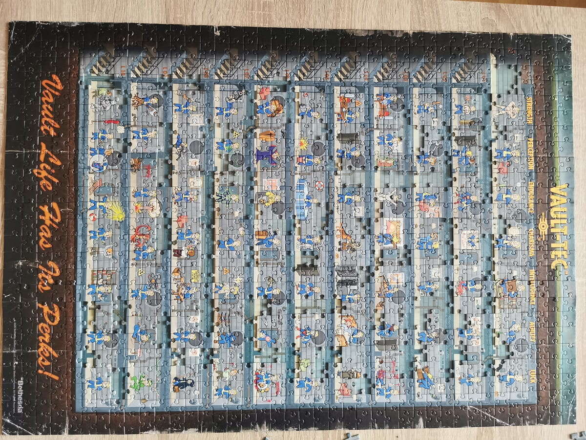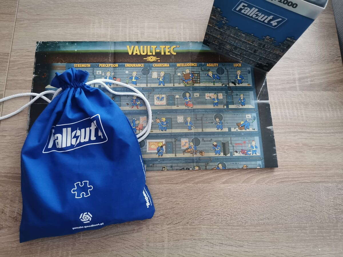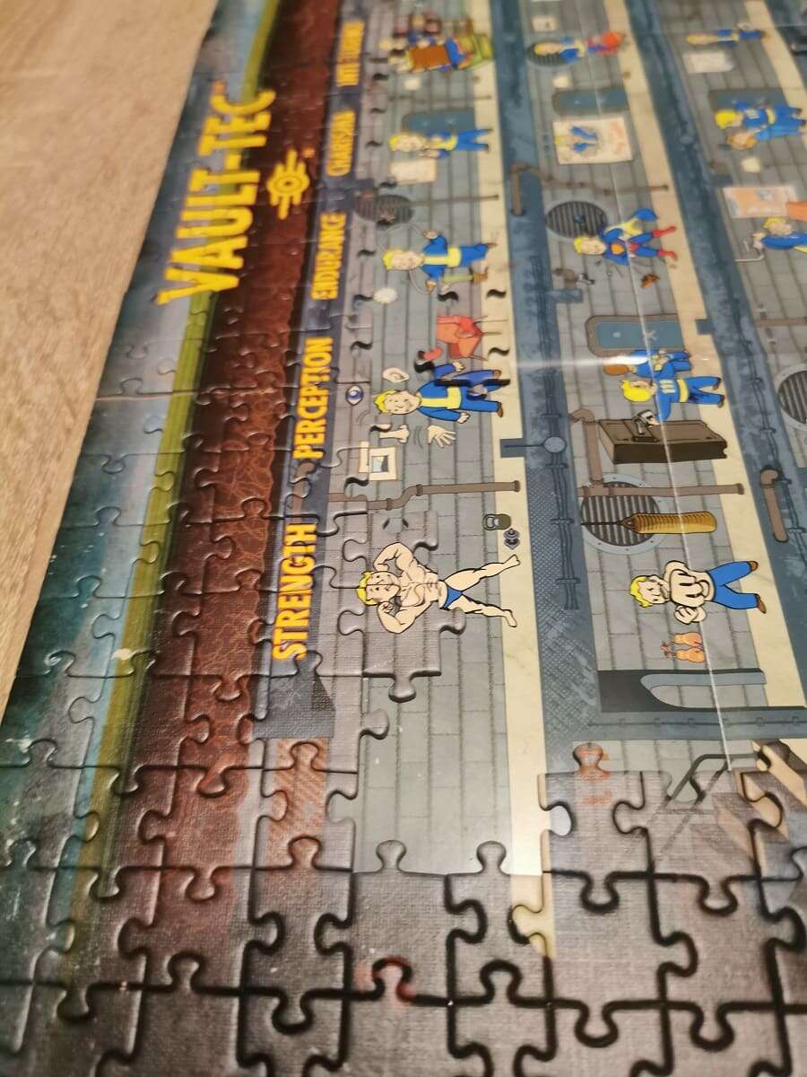 O wiele przyjemniejsze są już puzzle z Fallouta 4. Problematyczna w ich przypadku może być jedynie ramka, bo potem wszystko idzie bardzo szybko i sprawnie. To zasługa grafiki składającej się z wielu małych obrazków, bardzo łatwo szuka się poszczególnych elementów. No, oczywiście o ile całość składacie na dołączonym do puzzli plakacie. Dla mnie było to zdecydowanie łatwiejsze i przyjemniejsze. By ułożyć tę grafikę potrzebowałam około 4-5 godzin, choć przez połowę tego czasu miałam jeszcze dwóch pomocników. Zdecydowanie te puzzle bardziej nadają się do układania ze znajomymi, kiedy już przebrniemy przez ramkę i schody po lewej stronie można mieć sporo zabawy z poszukiwaniem poszczególnych wariantów Valut Boya. Jednak w tym przypadku po ułożeniu grafika z odległości jest niewyraźna, zbyt duża ilość detali sprawia, że z daleka po prostu niewiele dostrzeżemy.