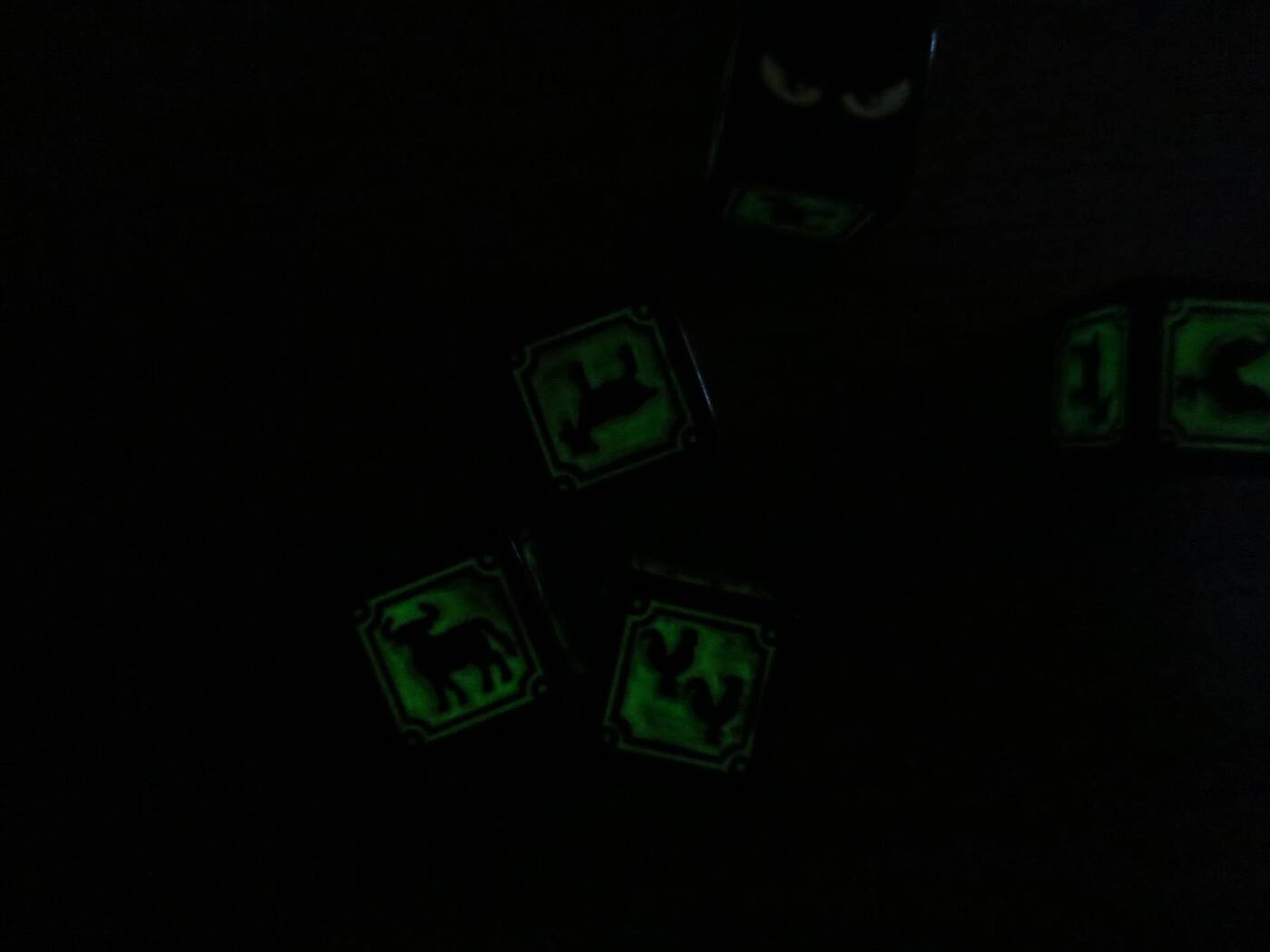 Na deser pozostawiłem sobie kostki. Są fantastyczne! Ciężkie, solidne, z całkiem przyzwoitymi oznaczeniami… jednak największym „bajerem” jest fluorescencja. Tak, te kostki świecą w ciemnościach :-) Oczywiście trzeba dać im troszkę czasu na naświetlenie, ale efekt przy zgaszonym świetle jest przynajmniej satysfakcjonujący.