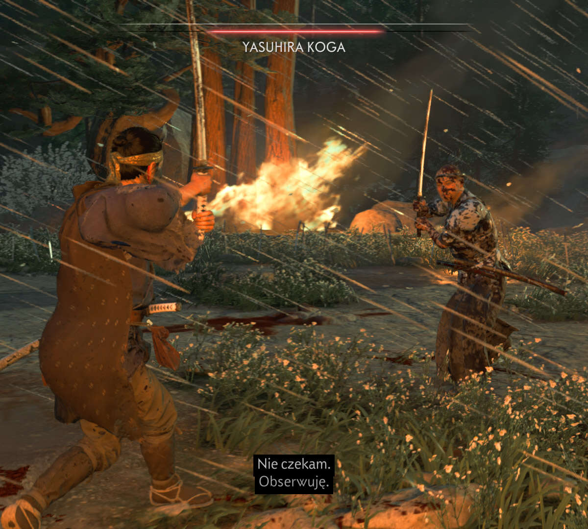 Takich pierdół jest więcej. Ubrania naszego bohatera co chwilę prześwitują przez broń, a komicznie wygląda to jak przed starciem z „minibossem”, które zaczyna się kapitalną cutscenką widzę… element pancerza wbijający się bohaterowi w głowę. Inna rzecz – wchodzą do kolejnego identycznie wyglądającego namiotu czy pokoju i… nic nie widzę. Dlaczego główny bohater, wzorem innych gier, nie może mieć ze sobą małej pochodni? Dlaczego raz na jakiś czas gdy chcę dokonać cichego zabójstwa w stylu ukrytego ostrza to po kliknięciu odpowiedniego przycisku bohater wykonuje normalny atak, a nie zabójczy cios. Dlaczego… i tak można bez końca. Tutaj co chwilę trafiamy na sytuacje, w których zastanawiamy się dlaczego, gdy inne gry już to mają – Tsushima tego nie ma. Gramy dalej, ale… czy Wiedźmin czy Assassin’s Creed czy Horizon: Zero Dawn – wszyscy już to wykonali lepiej.