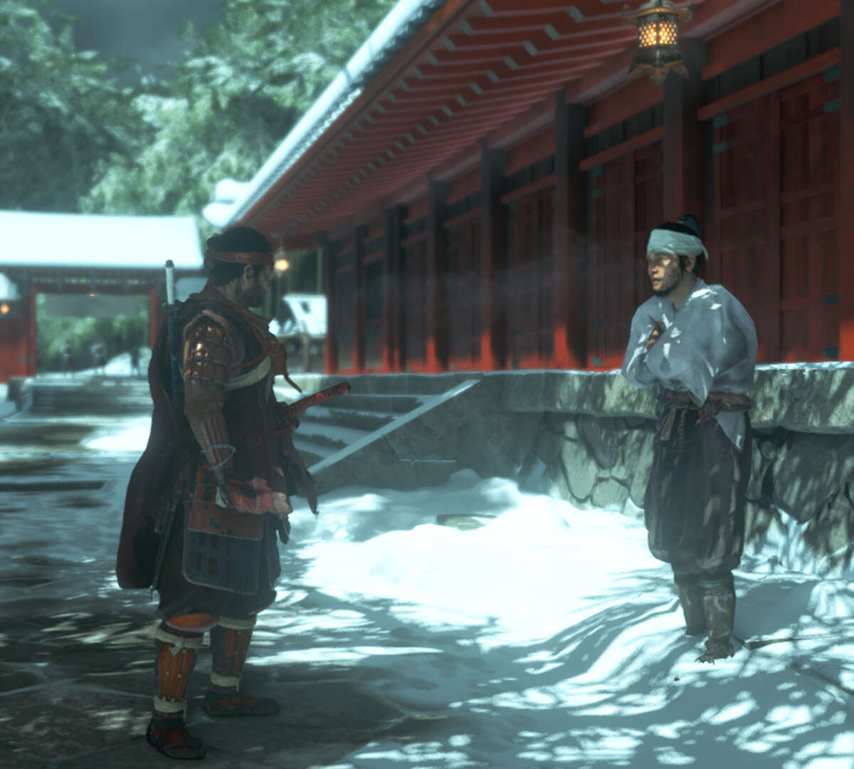 Scenki przerywnikowe to chyba największe olanie sprawy. Twórcy wymieszali przygotowane wcześniej cutscenki, które wyglądają dobrze z… Mafią 3. Kojarzycie jak w trzeciej Mafii bohaterowie stoją jak kołki przed sobą, ledwo się ruszając a kamera jest od nich oddalona? Tą rzecz, którą tak krytykowano? No to tutaj jest to samo. Słuchamy jak bohaterowie sobie rozmawiają i stoją przed sobą. Naprawdę nie można było zrobić zbliżenia na ich twarze i dodać proste animacje podczas rozmów, tylko skorzystano z krytykowanego powszechnie rozwiązania? Chociaż może lepiej, że nie ma tych animacji, bo w Ghost of Tsushima są one tak często urwane, iż cały klimat wiszący na sznurku już ledwo wisi. Deweloperzy nie raz już podczas tej generacji chwalili się systemami, które pozwalają na płynne przechodzenie pomiędzy animacjami, a tutaj… mamy 2010 rok.