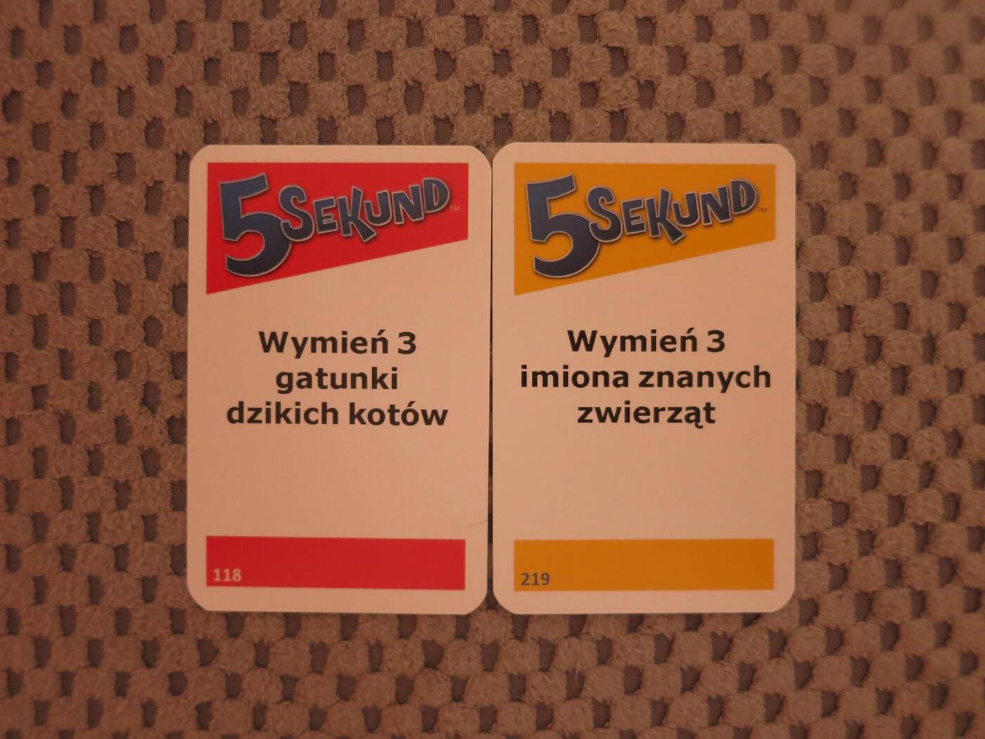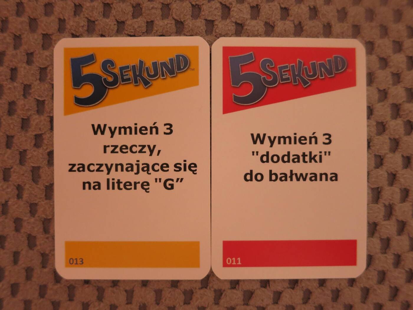 Mam natomiast pewne wątpliwości co do ilości kart. Teoretycznie jest ich naprawdę sporo (poza tym są dwustronne), jednak w praktyce zapas pytań wyczerpuje się naprawdę szybko. Wydaje się więc, że zbyt częste granie w 5 Sekund może nam zbrzydnąć. Łatwo jednak wydłużyć żywotność gry – skonstruowanie własnych kart nie powinno być większym problemem.