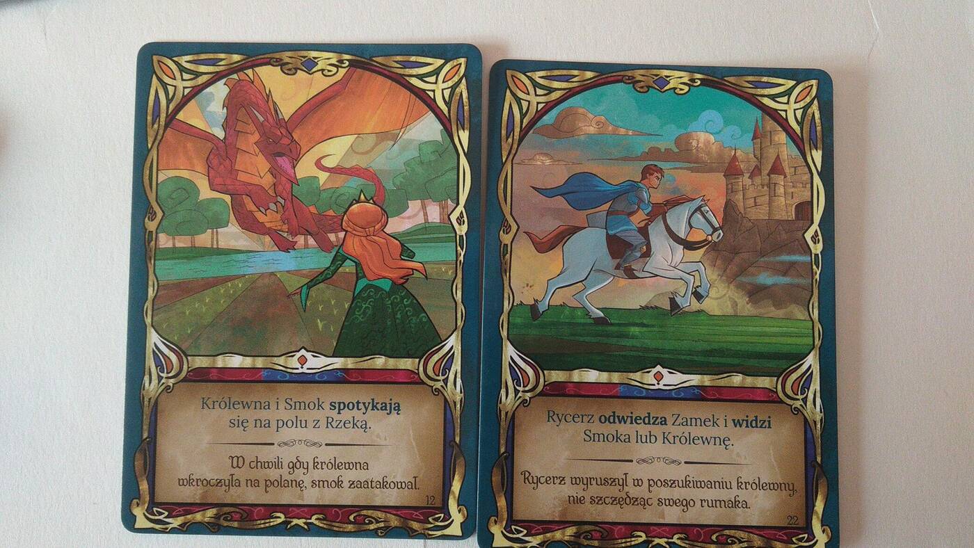 Przemieszczanie się figurek nie jest takie proste, jak się początkowo wydaje. O ile Rycerza i Królewnę łatwo ustawić, o tyle ze Smokiem trzeba się nagimnastykować. Nie ukrywam, że w ferworze walki troszkę zapomnieliśmy o baśniowej otoczce. Ta powróciła dopiero po zakończeniu gry i odczytaniu opowieści. Tutaj od razu powiem, że tekst z kart czasem jest aż nadto wyrwany z kontekstu, choć ostatecznie baśń napisała się całkiem nieźle.