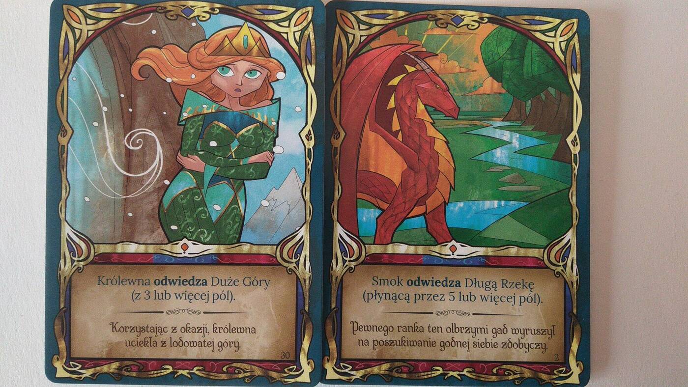 Również bardzo dobrze prezentują się kafelki, które przedstawiają tereny górskie, lasy, równiny oraz zamki z lotu ptaka. Czy raczej w tym przypadku Smoka. Karty są dobrej jakości, a grafiki świetnie trzymają baśniowy klimat. A wszystko to mieści się w wygodnej wyprasce. Cóż mogę powiedzieć Portalowi o wykonaniu: