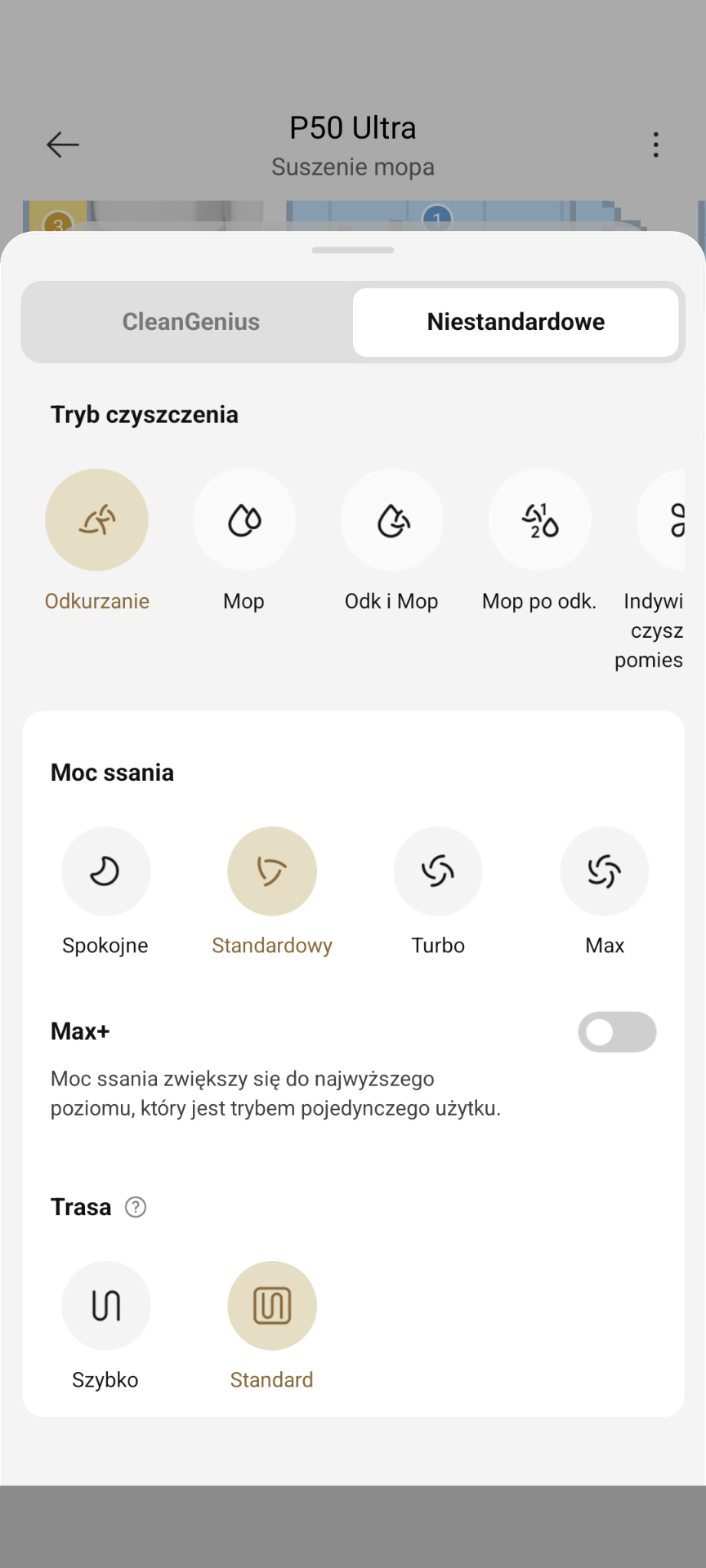 - podglądać w czasie rzeczywistym trasę sprzątania robota,