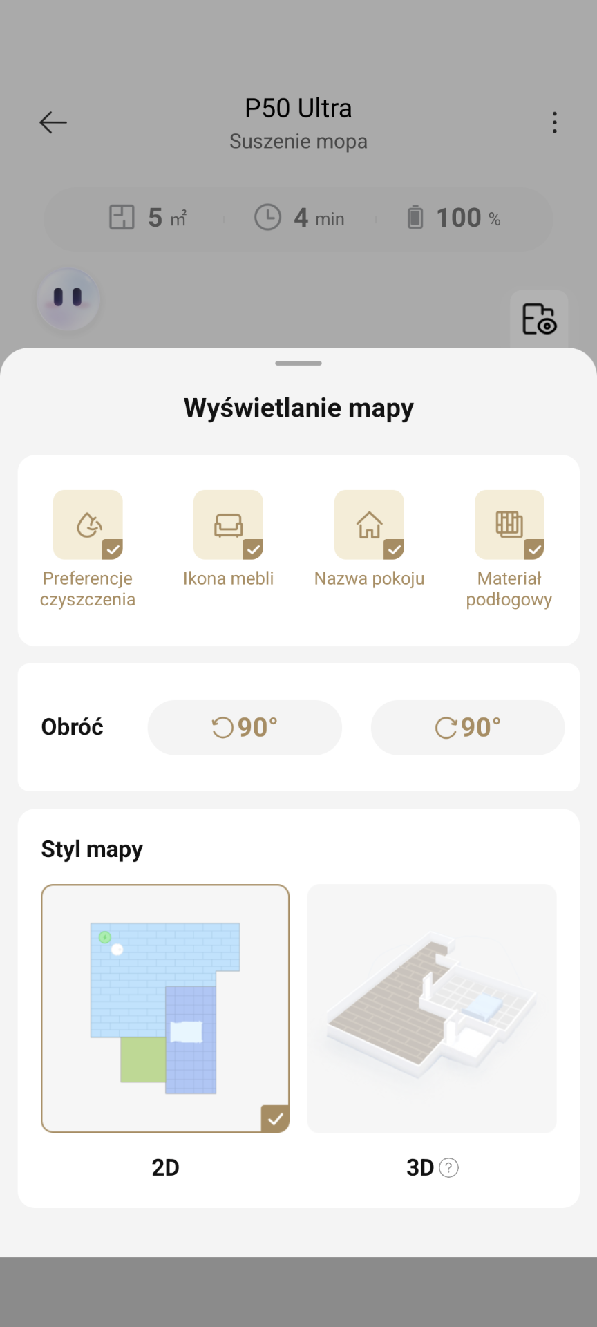 - włączyć/wyłączyć suszenie mopów po zakończeniu cyklu,