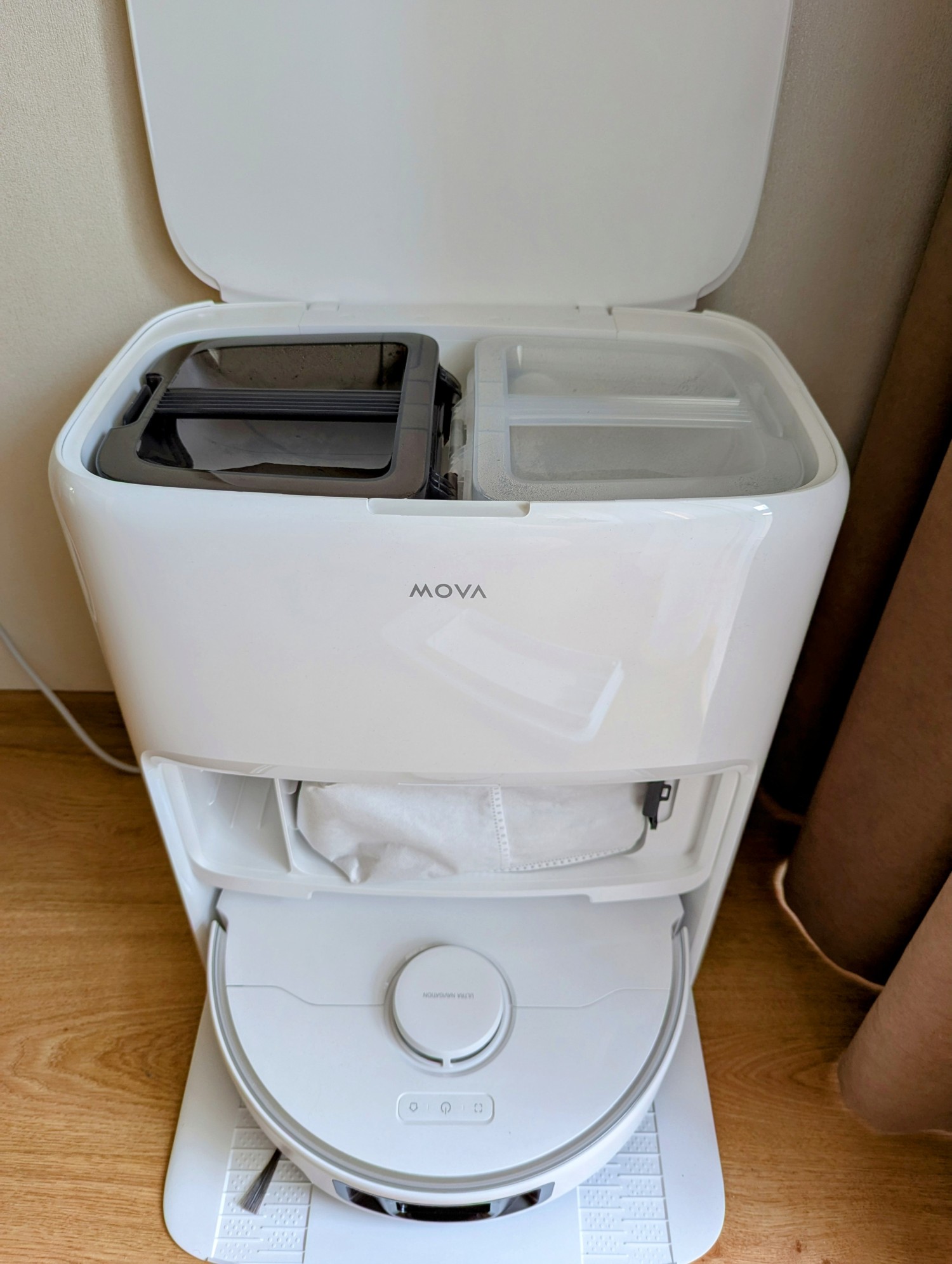 W codziennej praktyce widać wyraźnie, że system jest dobrze przemyślany. Czyszczenie mopów odbywa się dokładnie i bez bałaganu. Filtry i pojemniki można wyjąć jednym ruchem, bez rozkręcania czy brudzenia rąk. Nawet sam interfejs stacji (diodowe wskaźniki stanu i komunikaty w aplikacji) jest intuicyjny i zrozumiały.