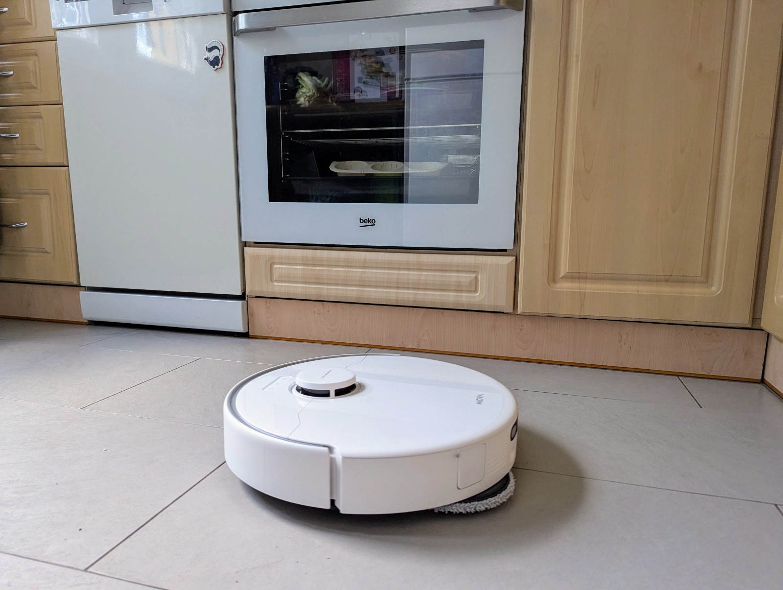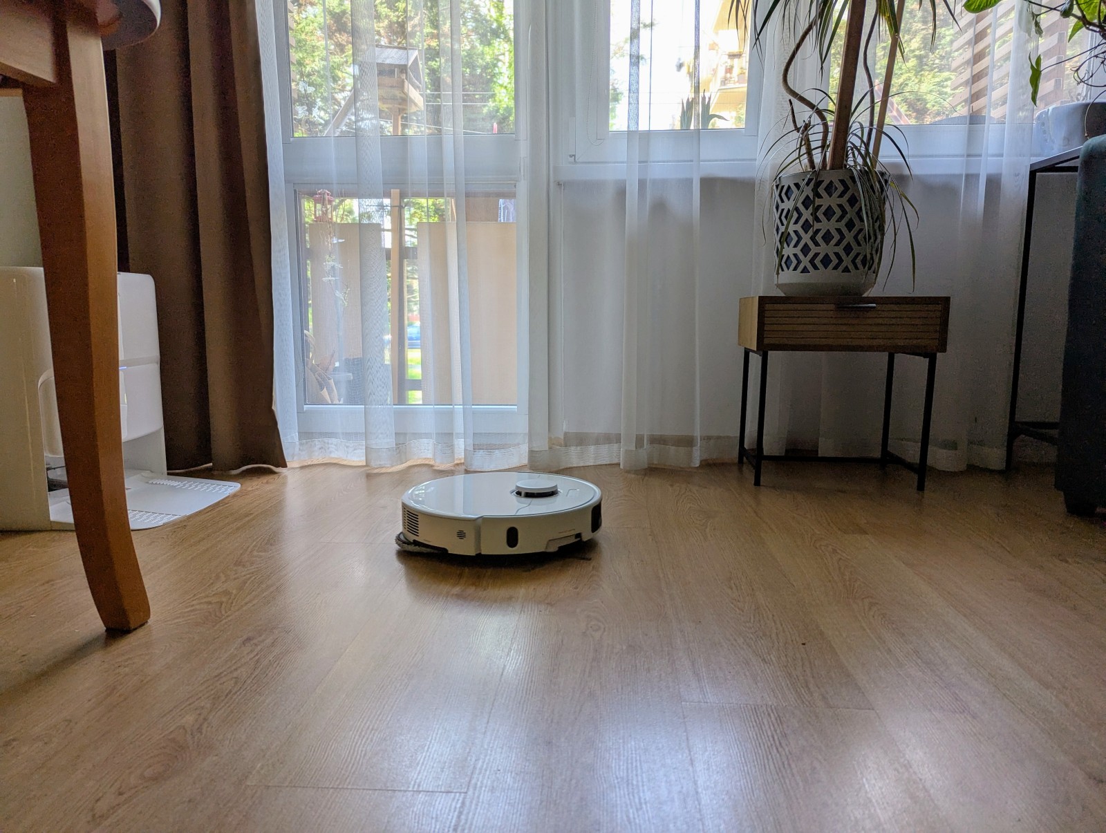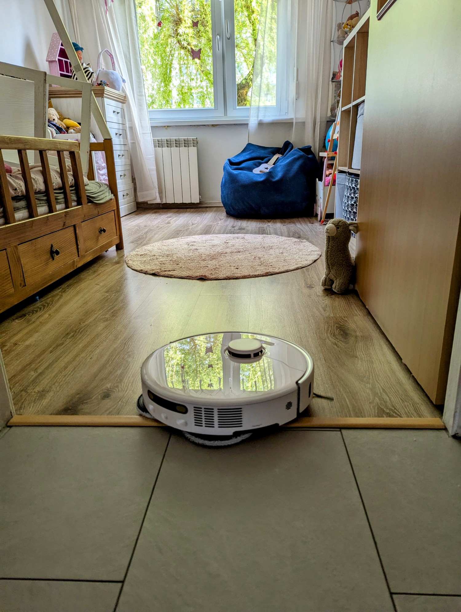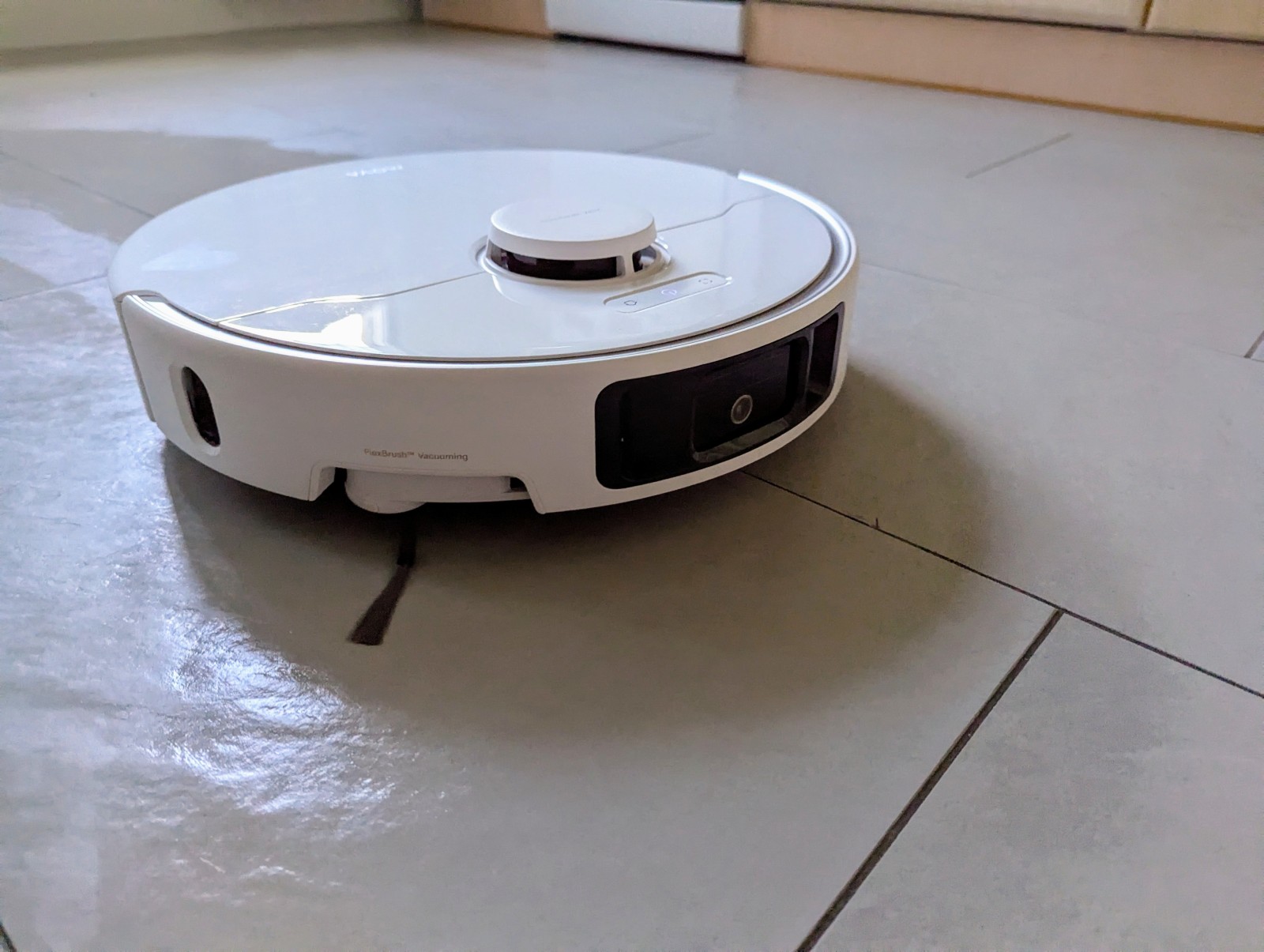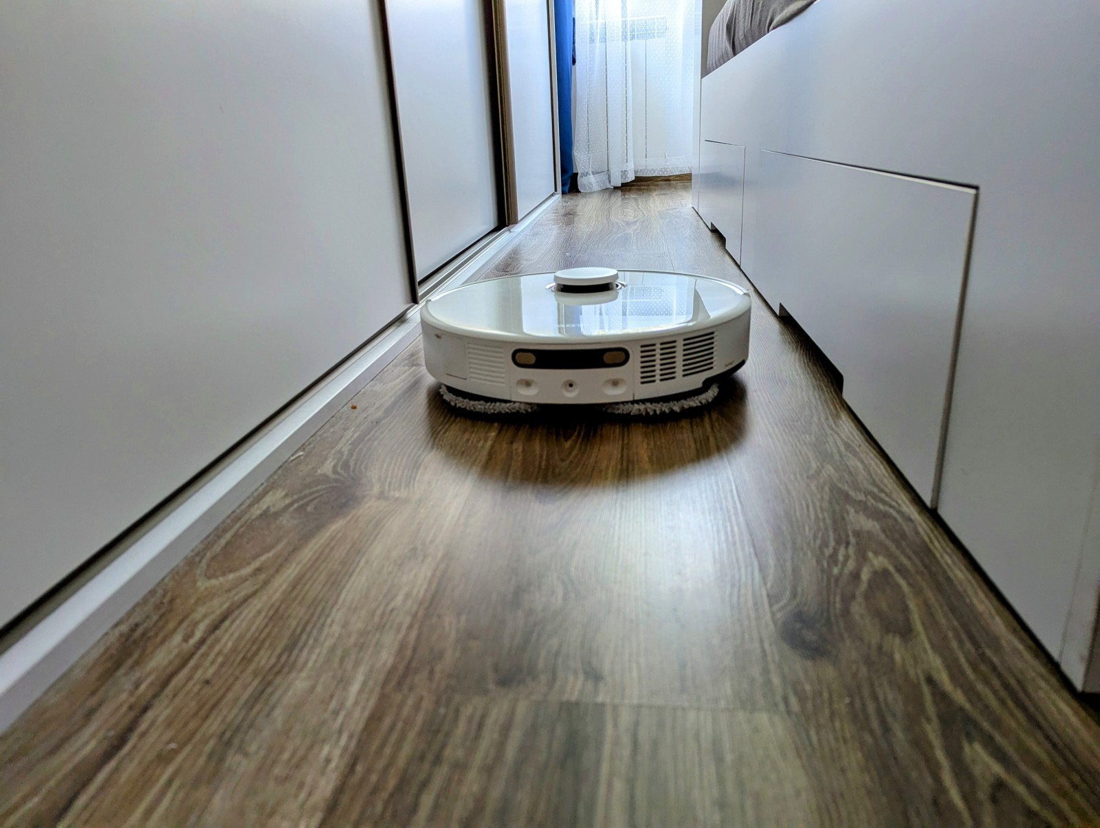 Testy w trudno dostępnych miejscach – pod łóżkiem, przy szafkach, przy nogach stołu – wypadły znakomicie. Robot z łatwością omija przeszkody, a wysuwane elementy skutecznie „zamiatają” zanieczyszczenia spod krawędzi. Widać, że nie działa tylko centralnie – pracuje „na szeroko”, co przekłada się na lepsze pokrycie powierzchni.