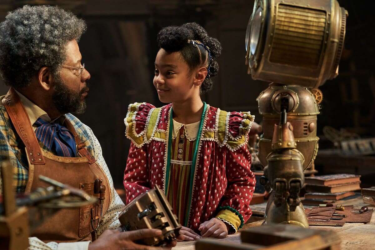W tym momencie muszę napisać o zachwycającej scenografii. Mamy tu do czynienia z pewną odmianą bardzo bogatego steampunku, co w takiej bajkowej, świątecznej odsłonie robi wrażenie. Bardzo podobają mi się stroje bohaterów, są nietuzinkowe, pełne barw i zdobień, nawet zgorzkniały i izolujący się Jeronicus nie został ubrany buro, choć jego wdzianka zostały nadgryzione zębem czasu.