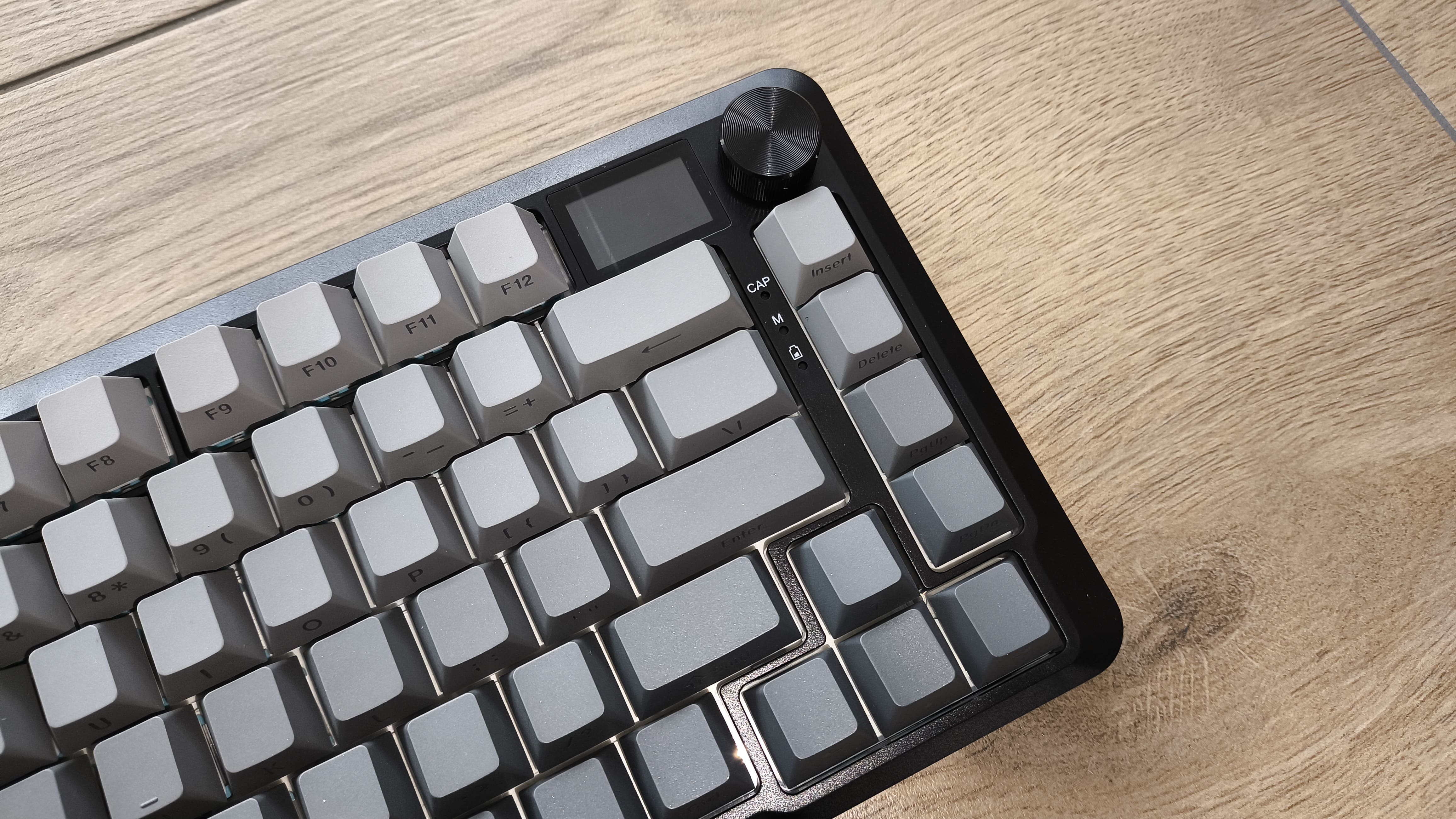Szczególną uwagę zwraca duże, precyzyjnie wycięte pokrętło aluminiowe tuż obok wyświetlacza. Pokrętło to służy do regulacji głośności, ale w zależności od ustawień może również sterować jasnością podświetlenia lub pełnić inne funkcje multimedialne. Samo pokrętło zostało wykonane z frezowanego metalu i działa z wyraźnym, przyjemnym skokiem. Nadaje ono klawiaturze bardziej profesjonalny, „streamerowy” wygląd i bez wątpienia przyciąga wzrok.