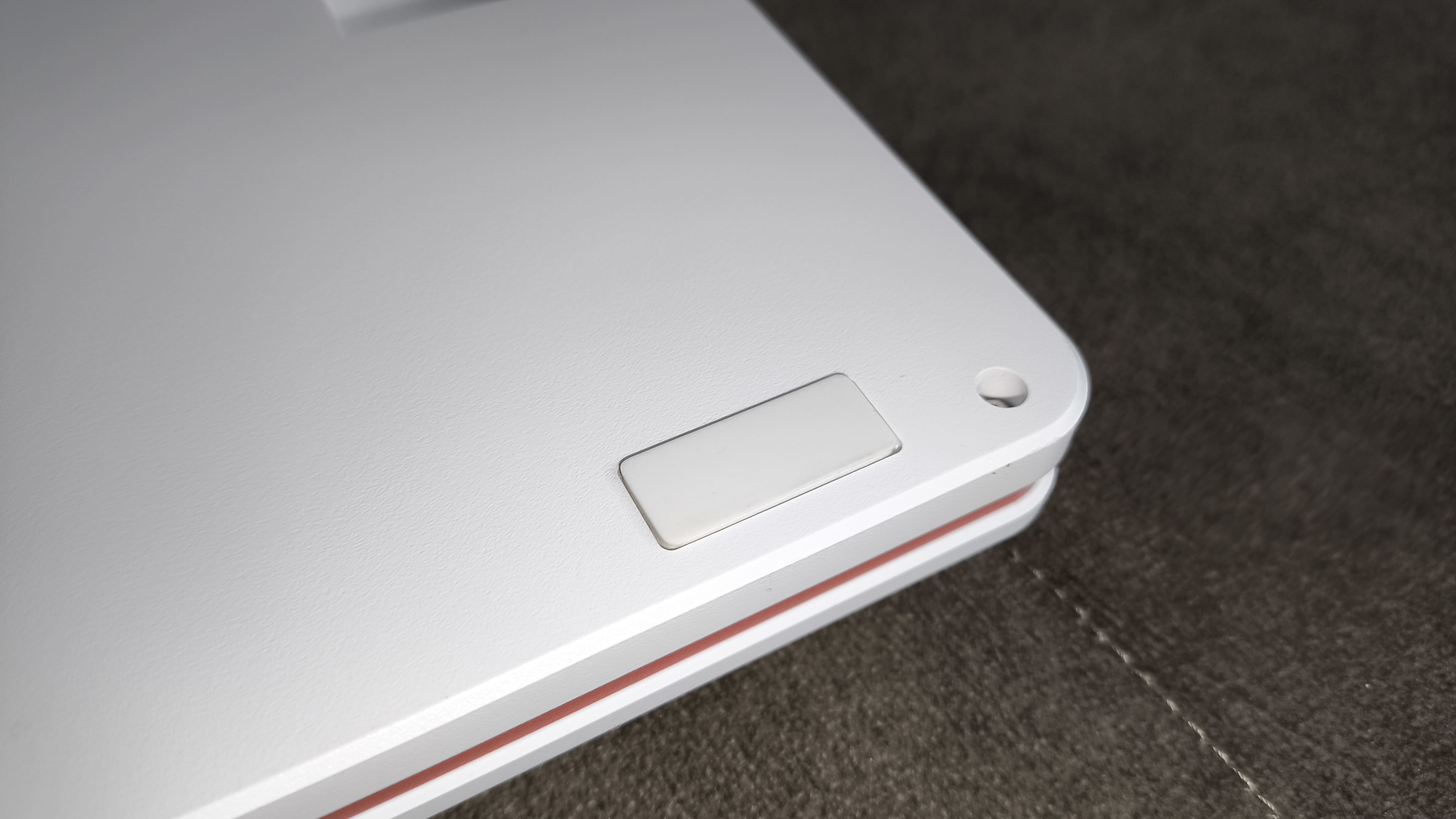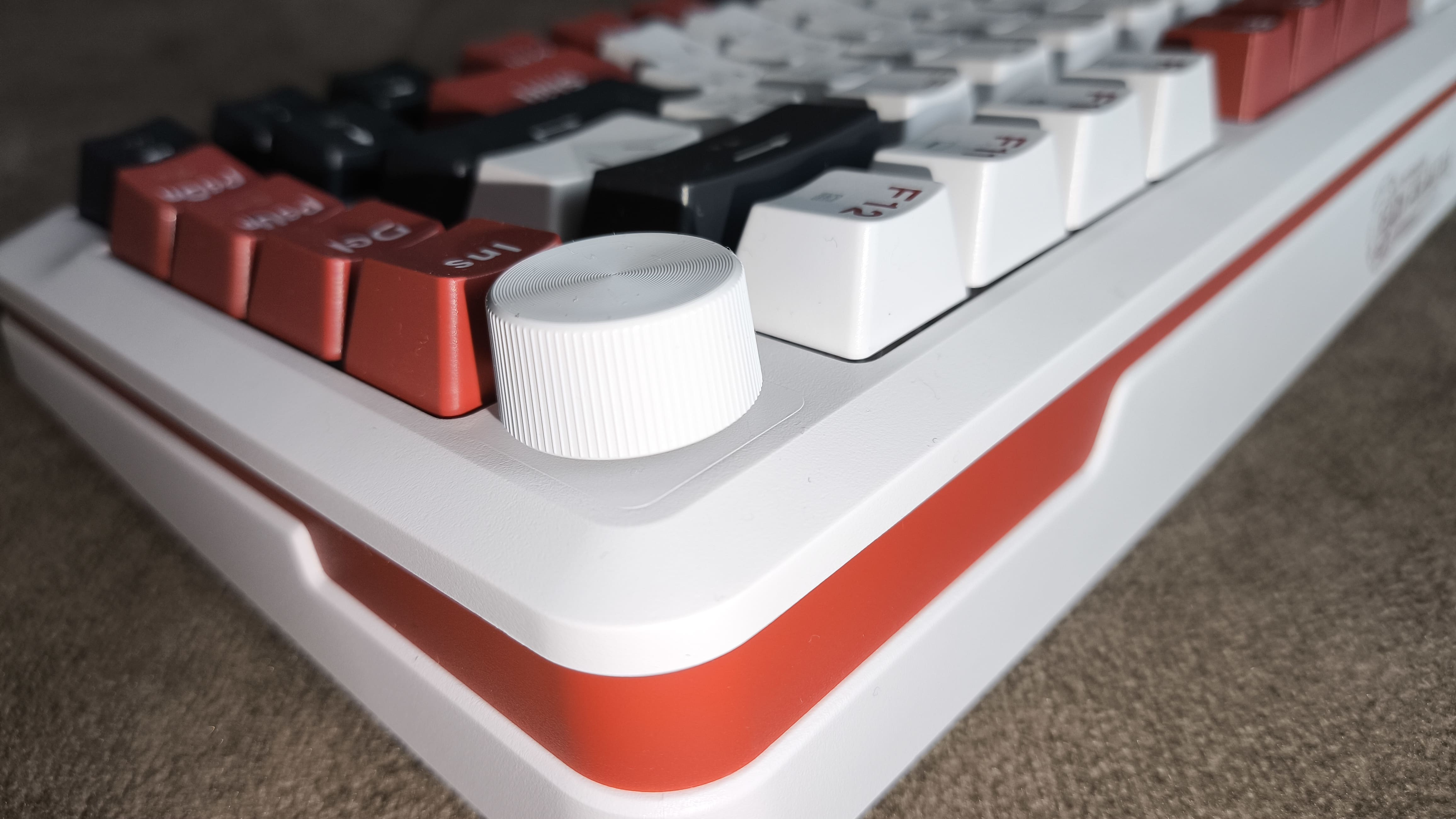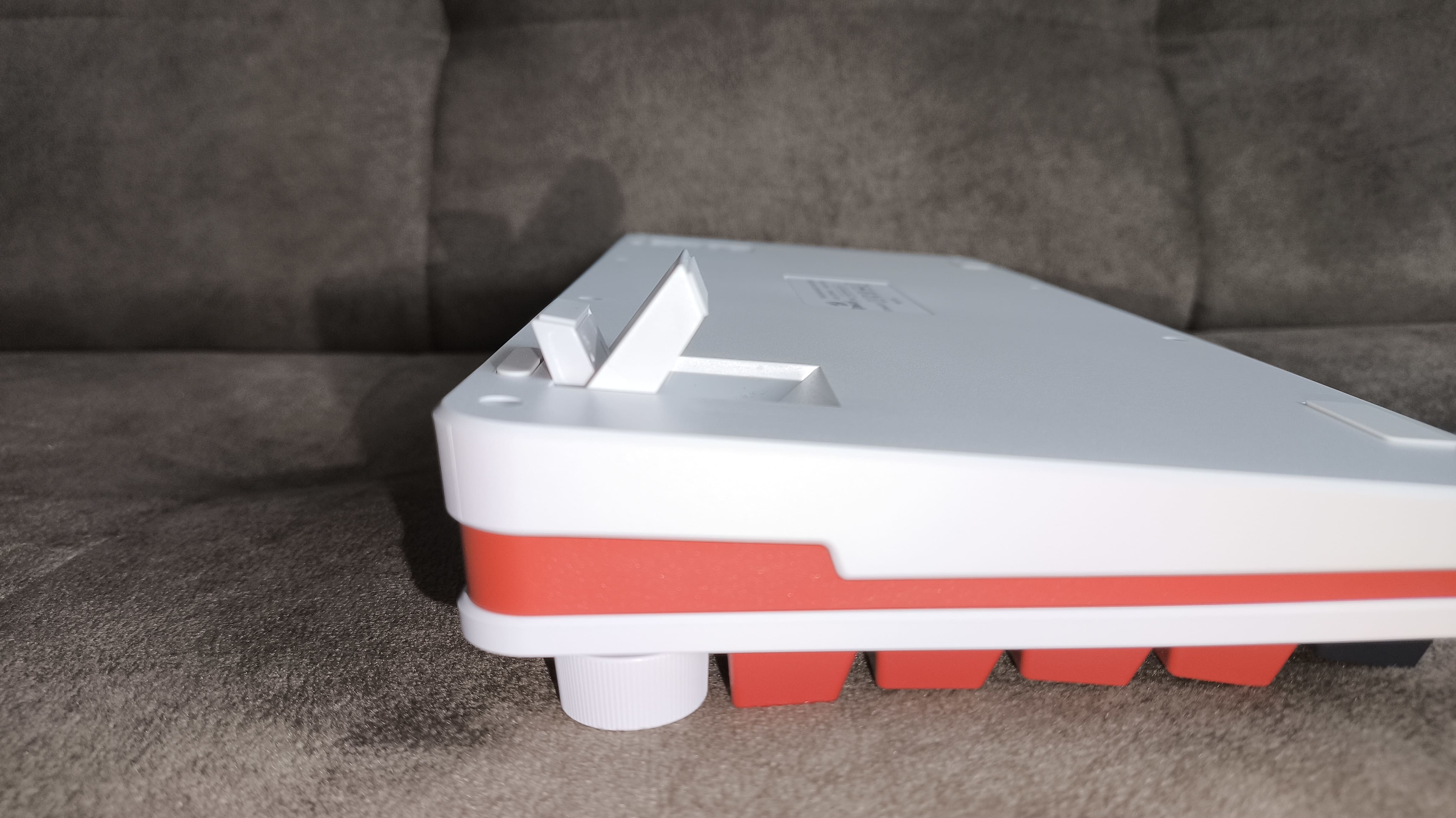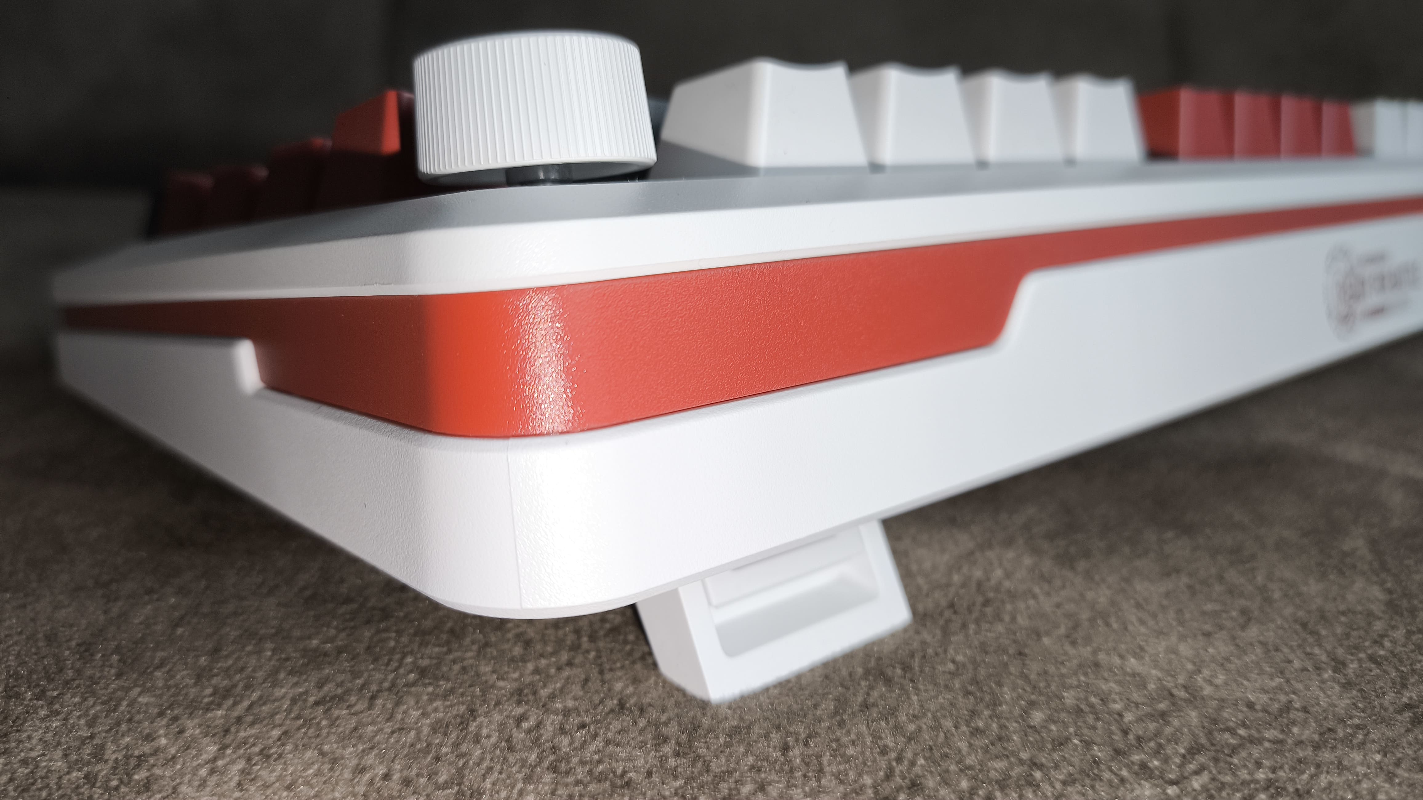 Konstrukcja klawiatury utrzymana jest w przyciągającym wzrok jednolitym, jasnym schemacie kolorystycznym — łączącym biel z subtelnym odcieniem burgundu. Ten drugi, ciemniejszy akcent pojawia się nie tylko na klawiszach, ale także w postaci nieregularnego paska biegnącego przez środek obudowy, który nadaje całości dynamiczny i lekko agresywny charakter. Obudowa dodatkowo posiada miękko zaokrąglone krawędzie i łagodnie ścięte ramki, co tym bardziej podkreśla styl nowoczesnego i ergonomicznego wyglądu.