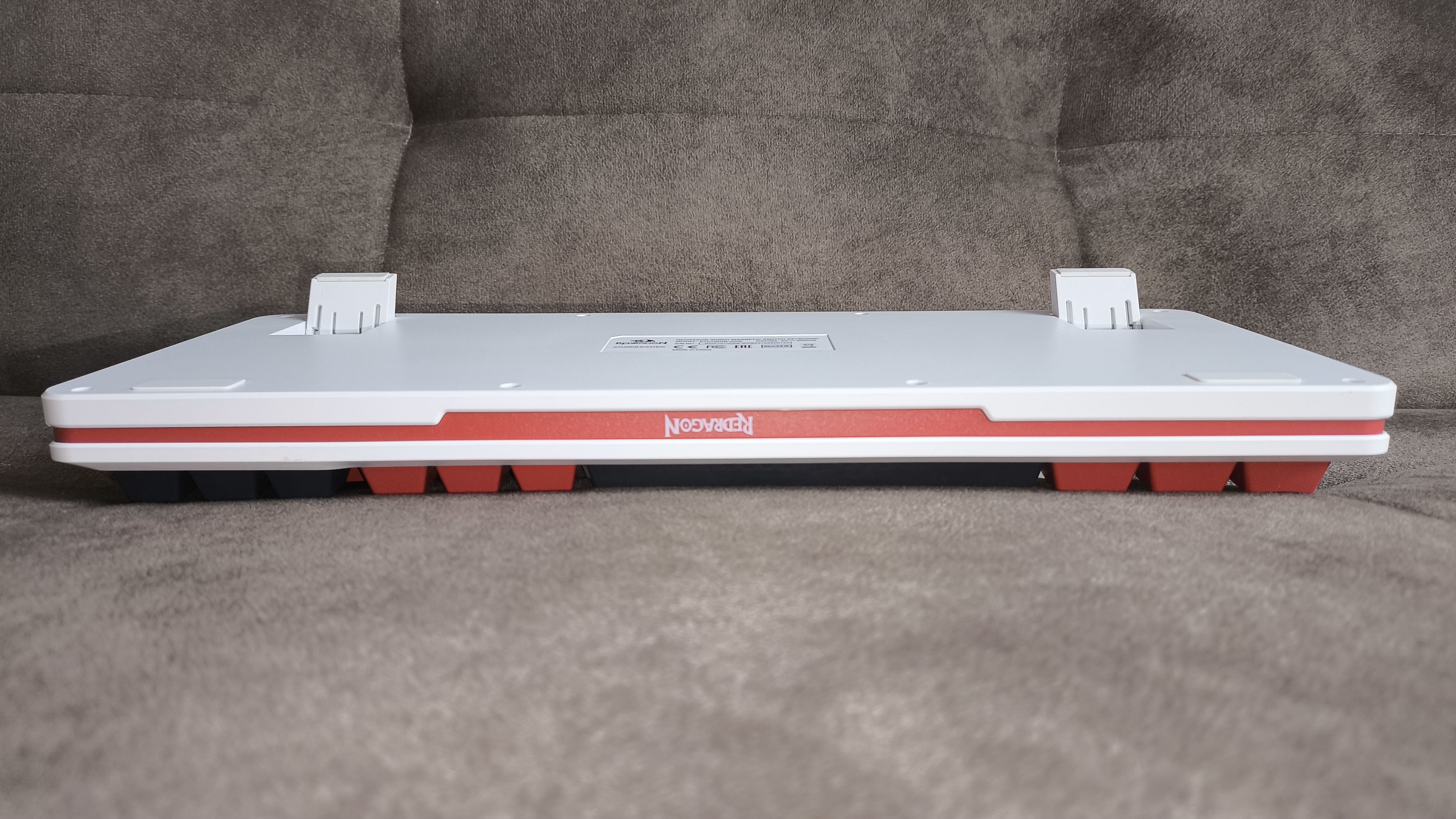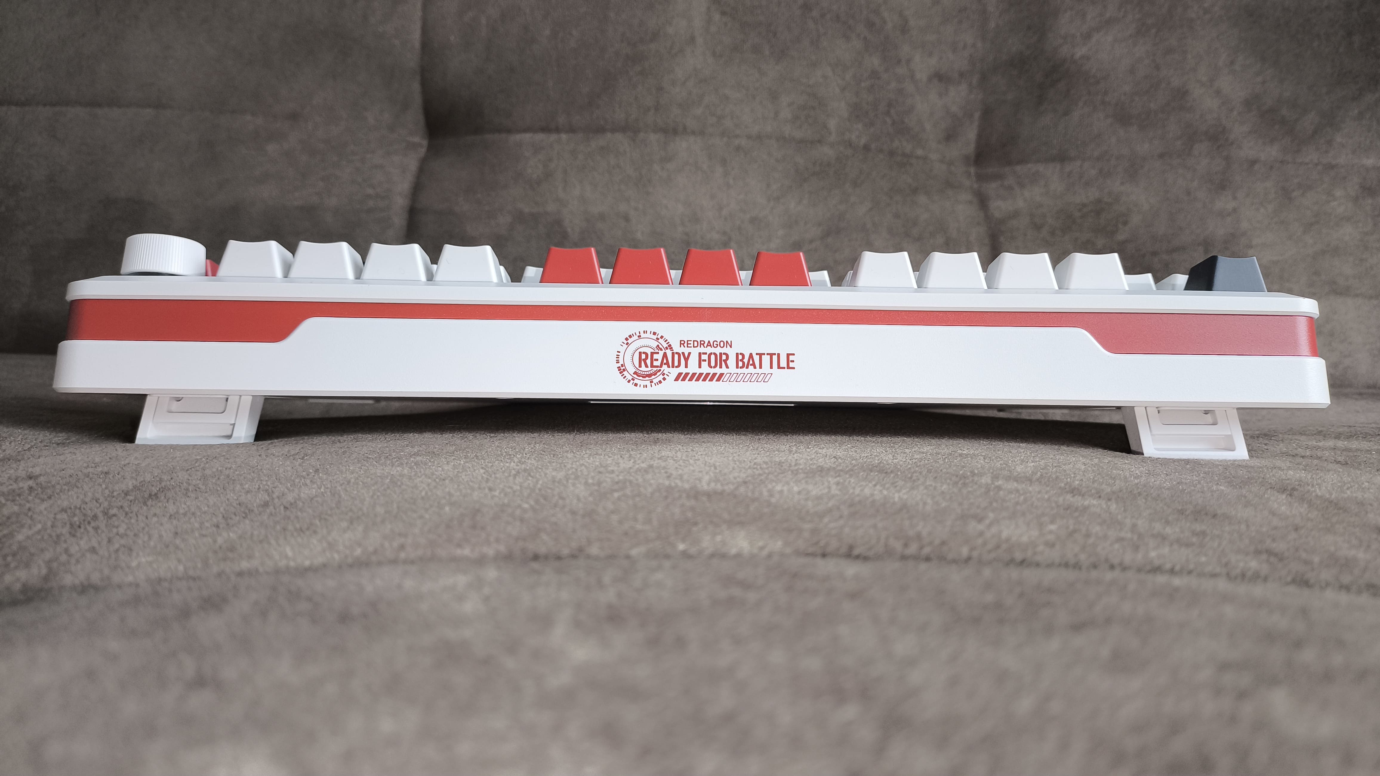 Logo producenta zostało umieszczone centralnie na froncie klawiatury, białą czcionką na bordowym tle, co dobrze komponuje się z całością. Niestety, tył urządzenia zdobi bardzo wyrazisty i estetycznie dyskusyjny nadruk „READY FOR BATTLE”, który zaburza spójność designu i wygląda na zbędny element wizualny.