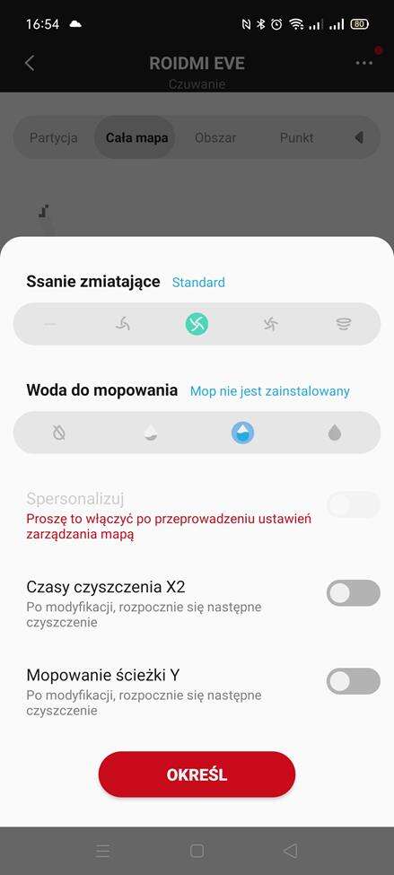 Roidmi Eve Plus oferuje ssanie z ciśnieniem 2700 Pa. Powinno to pozwolić na bezproblemowe zgarnięcie większości brudów. Moc ssania czy ilość wody przy mopowaniu możecie bez problemów ustawić w aplikacji.