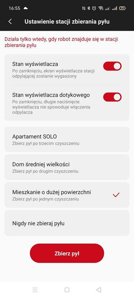 W aplikacje jest naprawdę mnóśtwo opcji do wyboru. Oprócz trybu pracy odkurzacza w tym włączycie specjalny tryb mopowanie ścieżki Y) i mopowania macie przedstawione mapy, którymi po zapisaniu możecie sterować. Bez problemów wskażecie na nich miejsca zakazane, puścicie robota do pracy tylko w określonej okolicy czy podzielicie pokoje na różne. Warto też przejść do ustawień, których naprawdę jest sporo. Możecie mu włączyć wykrywanie dywanu, zmienić ustawienia stacji zbierania kurzu (tudzież pyłu – tak brzmi ona w aplikacji). Nie zabrakło też możliwości ustawienia regularnego czyszczenia, sprawdzenia poprzednich czyszczeń czy zdalnego sterowania robotem. Jest tez możliwość zmiany jego głosu na żeński polski, który jest naprawdę przyjemny. Oczywiście dzięki aplikacji łatwo zaktualizujecie też jego oprogramowanie.