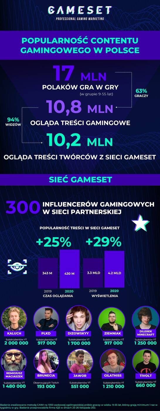 Zaś zdecydowanym liderem takich treści jest sieć Gameset zrzeszająca twórców gamingowych. Analizy wykazały, że 59% (ok. 10,2 mln) graczy w wieku 9-55 lat ogląda właśnie ich kanały. Na drugim miejscu zaś znaleźli się twórcy niezrzeszeni w żadnej polskiej sieci.