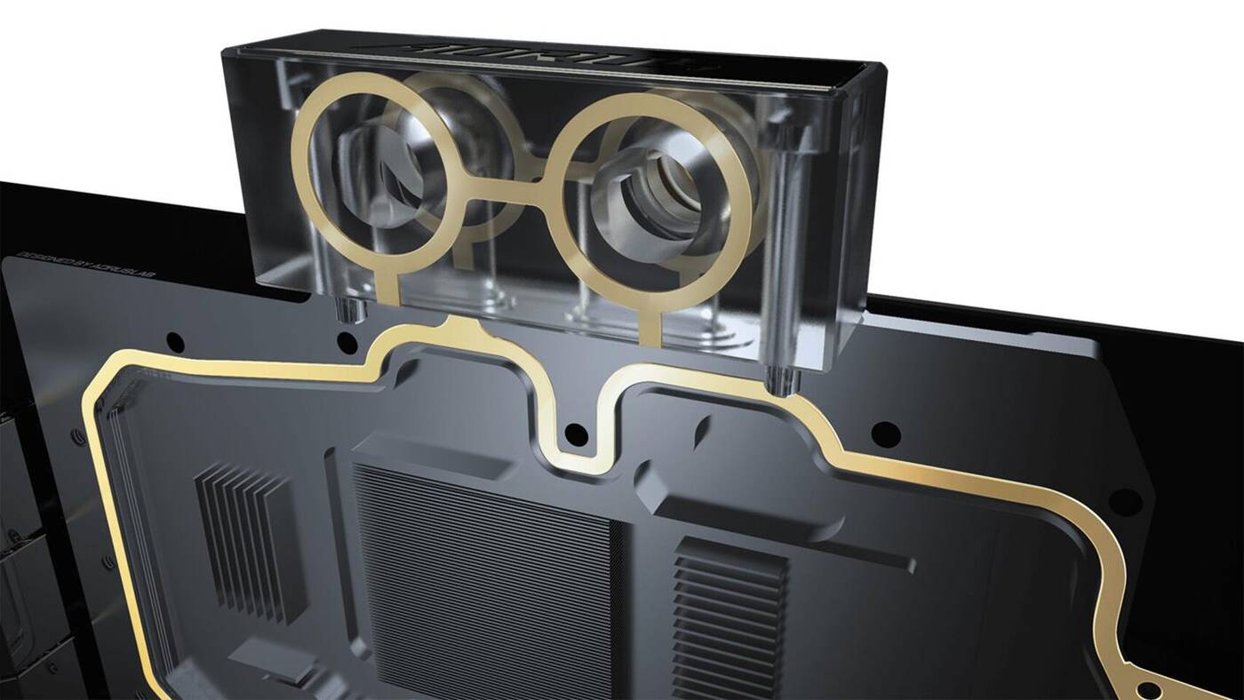 Za chłodzenie karty odpowiada rozbudowany blok wodny z bezpośrednim stykiem ze rdzeniem graficzny, pamięciami GDDR6X oraz sekcją zasilania, w którym znajdują się ciepłowody i komora parowa. System obiegu wody trafia z kolei do 240 mm radiatora z dwoma wentylatorami o podwójnych łożyskach.