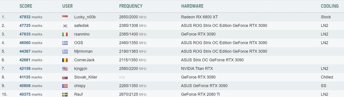 Uzyskany wynik to 47932 punkty, czyli o 225 punkty więcej od poprzedniego rekordu Asus ROG Strix RTX 3090 OC. Ciekawe, czy wraz z czasem nowe karty od AMD będą pobijały kolejne rekordy w grach czy benchmarkach. Pamiętajcie też, że niedługo nadjedzie RX 6900 XT, który będzie na pewno notował jeszcze większe wyniki.