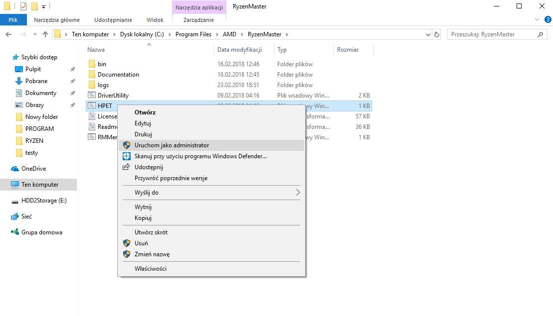 Pamiętajcie, że do podkręcania potrzebujecie płyty z chipsetem wyższym, niż A320 i A420. Ponadto powinniście się również zaopatrzyć w odpowiednie chłodzenie, ponieważ górny poziom temperatur w przypadku Ryzenów oscyluje gdzieś w granicy 95 stopni Celsjusza. Jednak zanim zaczniecie używać tej aplikacji, to lepiej upewnijcie się, że usługa HPET jest aktywna. Aby ją włączyć, wystarczy udać się do folderu z Ryzen Master i uruchomić skrypt HPET.bat w trybie administratora. Jeśli był wcześniej włączony, to zostaniecie o tym poinformowani, ale jeśli nie, to będziecie zmuszeni zresetować system.