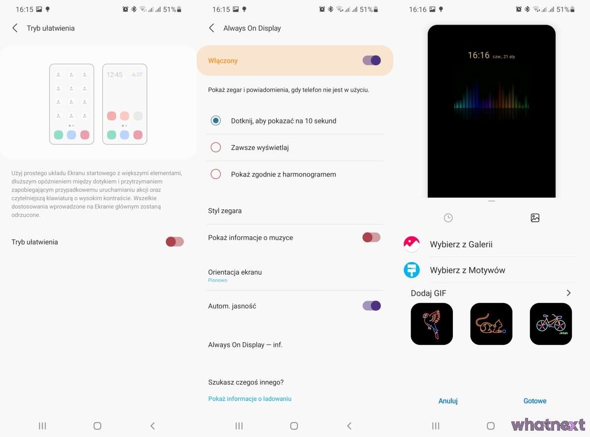 Interfejs OneUI daje nam sporo opcji personalizacji. Choć wiele rzeczy trzeba dodatkowo pobrać. Jak choćby motywy, ikony, czy styl ekranu Always On. A jest w czym wybierać. Oczywiście nie brakuje tematów kompletnie nieczytelnych, nawet jeśli są płatne, ale poświęcając dłuższą chwilę można bardzo łatwo znaleźć coś dla siebie. Tworząc przy tym interfejs jakiego może nie mieć nikt inny.