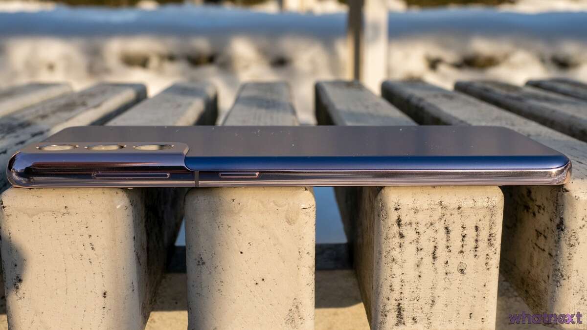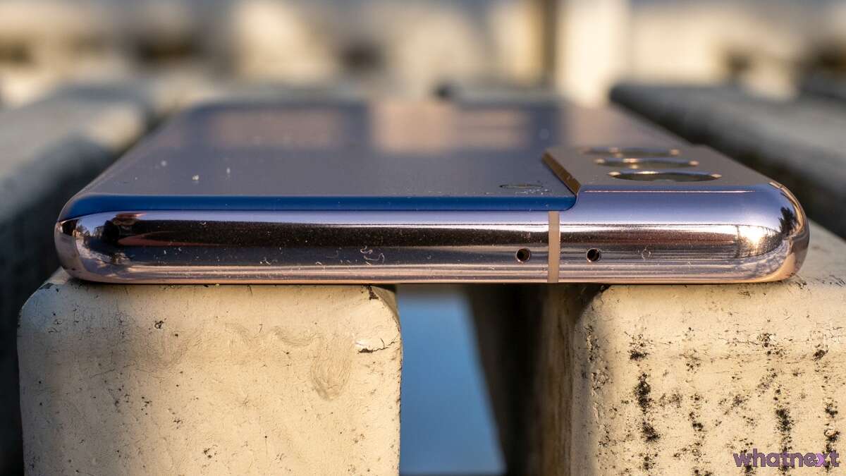 Tuż po wyjęciu z pudełka zdecydowanie nie byłem fanem połączenia niebieskiego i złotego koloru na obudowie Galaxy S21. O ile niebieski tył jest ok, podobnie jak złoty moduł aparatu, tak złoty korpus… Ale po kilku dniach skutecznie się do niego przyzwyczaiłem. Pomogła myśl, że mogło być gorzej. Korpus jest dosyć szeroki i srebrny oraz bardziej złoty wyglądałby wręcz odpustowo. Tutaj mamy kolor zbliżony do różowego złota i ostatecznie nie jest tak źle.