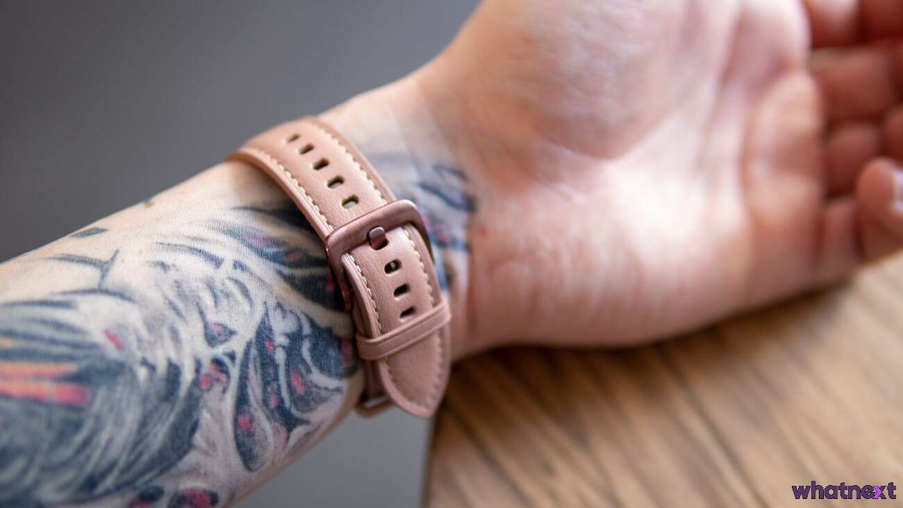 Minusy w wariancie 41mm są głównie kosmetyczne. Ekran mógłby być nieco wyżej osadzony, przez co wydawałby się większy. Z kolei skórzane paski wypadają słabo. Przynajmniej w czarnym wariancie. Biała nić szybko się brudzi, a skóra delikatnie marszczy. Stawiałbym jednak na silikonowy pasek, ew. skórzany zostawił tylko wtedy, kiedy zegarek ma być bardziej elegancki. No i to nieszczęsne mierzenie nasycenia krwi, ale wykonanie skutecznego pomiaru jest problematyczne w zasadzie w każdym zegarku.