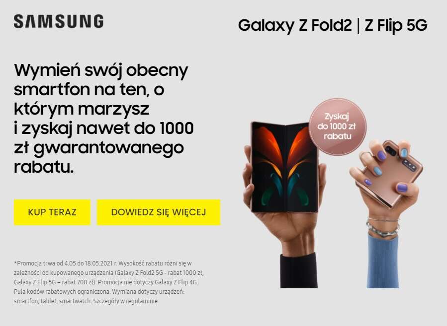 W wybranych sklepach cena smartfona Samsung Galaxy Z Fold 2 5G została obniżona o 1300 zł – z 7899zł na 6599zł (nieoficjalnie mówi się, że obniżka trwa do niedzieli), do tego Samsung przygotował specjalny dodatek w wysokości 1000 zł, pod warunkiem, że odsprzedamy im swoje obecne urządzenie. Może to być smartfon, tablet a nawet smartwach. Jak tego dokonać, dokładnie przeczytacie tutaj, bo najpierw urządzenie trzeba wycenić. Rabat 1000zł dotyczy zakupu Galaxy Z Fold 2 5G, ale można skorzystać z niego kupując też model Galaxy Z Flip 5G, ale wówczas rabat wynosi 700zł. Pamiętajcie jednak, że pula tych kodów rabatowych jest ograniczona, zaś sama promocja trwa do 18 maja.