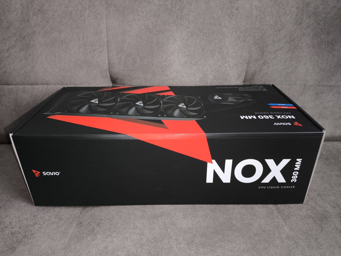 Savio Nox 360 mm trafia do użytkownika w stosunkowo dużym, estetycznie zaprojektowanym pudełku utrzymanym w czarno-czerwonej kolorystyce, charakterystycznej dla aktualnej identyfikacji wizualnej marki. Front opakowania prezentuje duże zdjęcie całego chłodzenia — z trzema wentylatorami 120 mm, radiatorem 360 mm oraz blokopompką z logotypem Savio.
