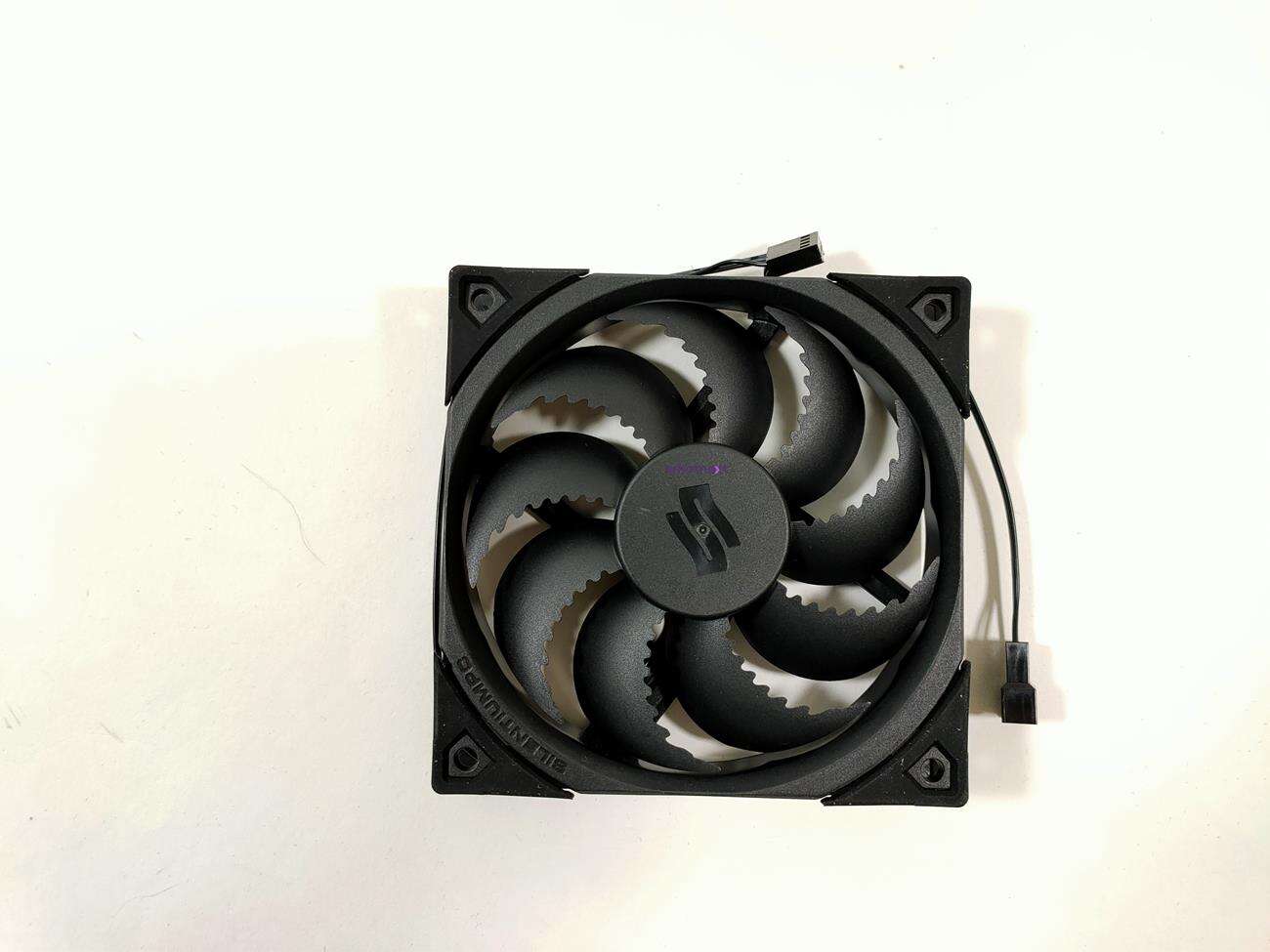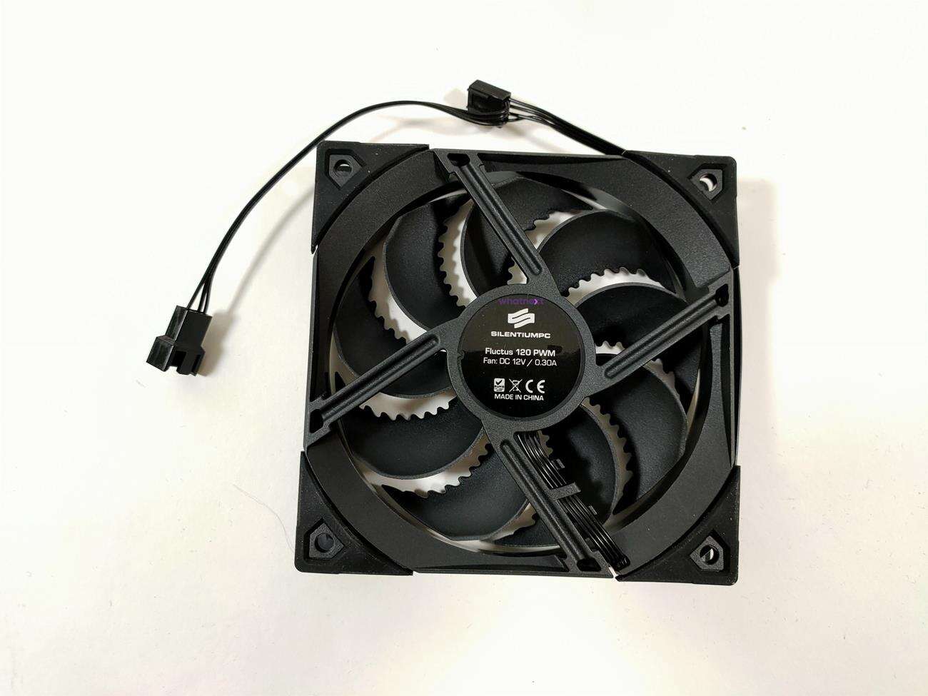 W zestawie znajdziemy jeden albo dwa wentylatory Fluctus 120 PWM. Oaprte są one o łożysko FDB a żywotność wynosi 100 tysięcy godzin. Maksymalne obroty to 1800 RPM. Tutaj producent nie podaje dokładnego przepływu powietrza, ciśnienia ani głośności. Wszystkie te parametry maja jednak być bardzo dobre. Wentylator ma łopatki ze specjalnymi nacięciami, które mają pozytywnie wpływać na jego działanie. Nie zabrakło tez gumowych nakładek w miejscu mocowania. SIlentiumPC wspomina też o czasowym wyłączeniu śmigieł przy niskim obciążeniu. Wentylatory mają złącza 4 pin PWM męskie i żeńskie – bez problemów połączycie kilka śmigieł.