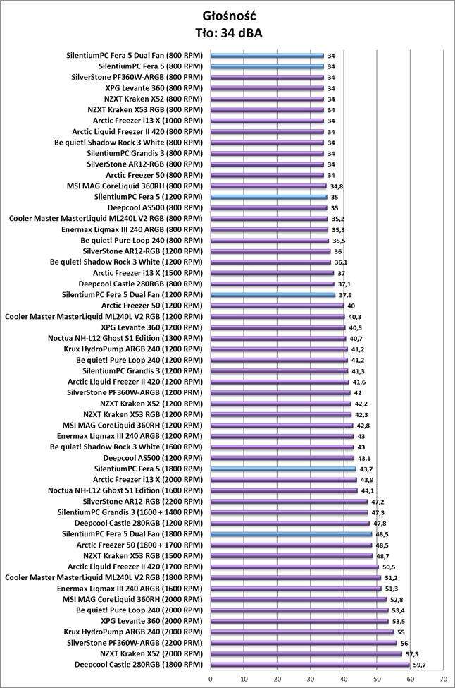 W swojej cenie Fera 5 zapewnia bardzo dobrą wydajność. Dodatkowy wentylator w wersji Dual Fan jeszcze poprawia tę sytuację o 1-2°C. Wyniki może i znajdują się na spodzie rankingu, ale zbyt dużo tańszych chłodzeń ostatnio nie miałem do testów. Warto więc tutaj zwrócić uwagę na równice w stosunku do Grandisa 3, które są mniejsze od spodziewanych. Chłodzenia bez problemu radzą sobie też z konkurencją od SilverStone. Co więcej nowe wentylator naprawdę cicho działają. Tak naprawdę usłyszycie je jedynie na maksymalnych obrotach i to w przypadku wersji Dual Fan. Przy modelu z jednym wentylatorem może wtedy nie ma ciszy, ale jest całkowicie akceptowalnie w szczególności jak na 1800 RPM.