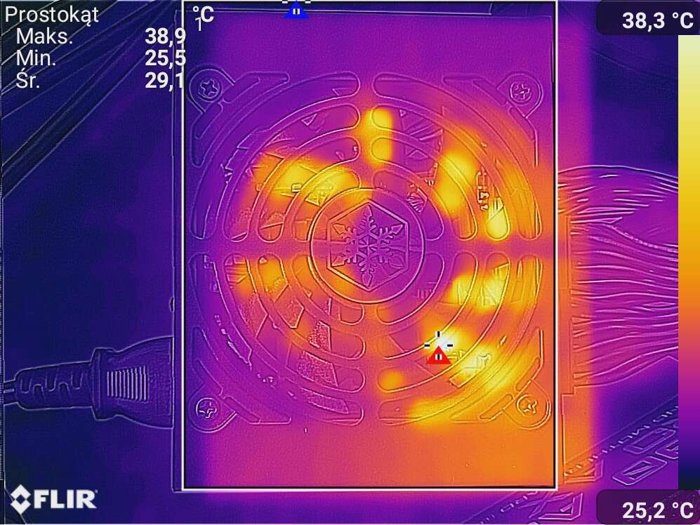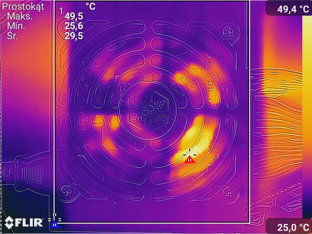 Spoczynek polegał tylko na wyświetlaniu pulpitu. Obciążenie to FurMark + Cinebench R23. W testach temperatury wykorzystałem moduł termowizyjny smartfonu CAT S61.