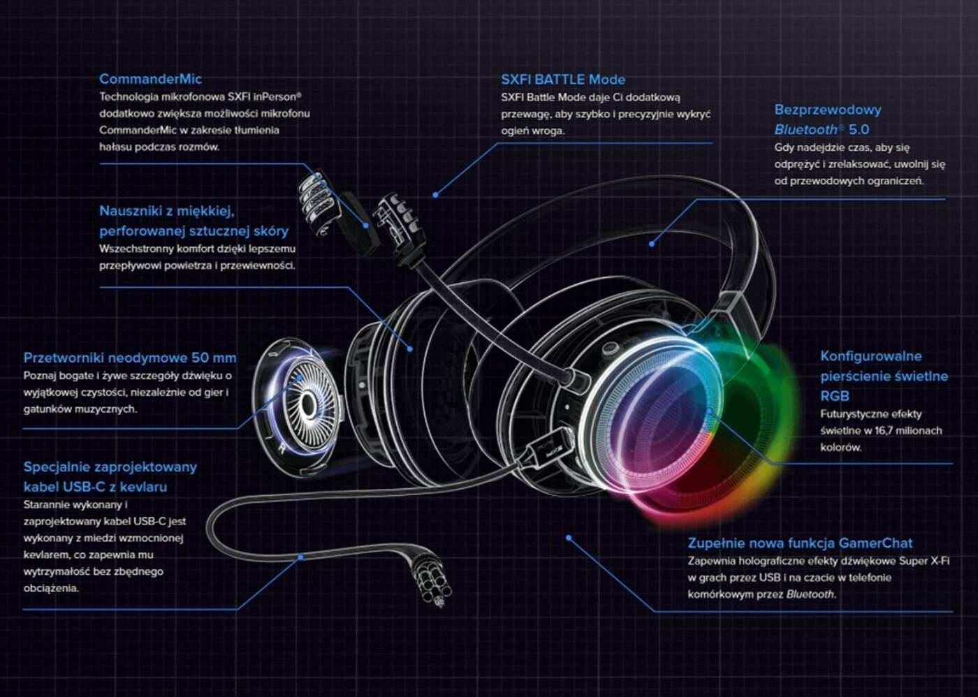 Te słuchawki nauszne ze skórzanymi, perforowanymi nausznikami z pianką memory mogą pochwalić się wysokim komfortem, czy 50-mm przetwornikami, które wspierają technologię przestrzenną Super X-Fi oraz nowy tryb SXFI Battle z myślą o grach. Na pokładzie nie zabrakło też podświetlenia i wbudowanego w muszlę panelu dotykowego z myślą o sterowaniu odtwarzaczami muzyki.