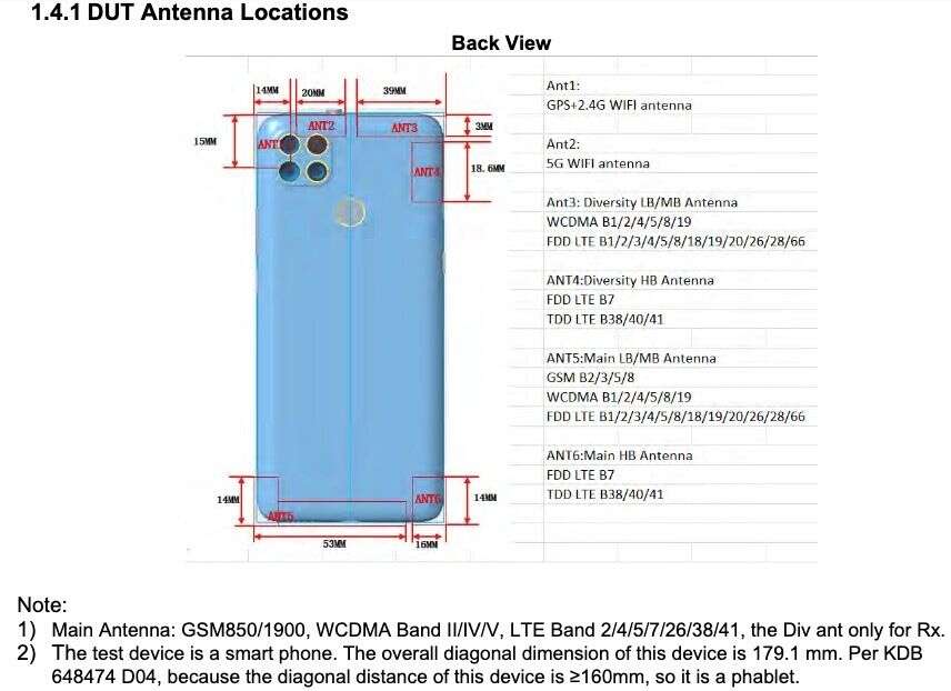 FCC daje spojrzenie na tył smartfona. Kolorystyka jest niebieska i znajdują się tam trzy aparaty wraz z lampą błyskową LED. Nie zabrakło też czytnika linii papilarnych.