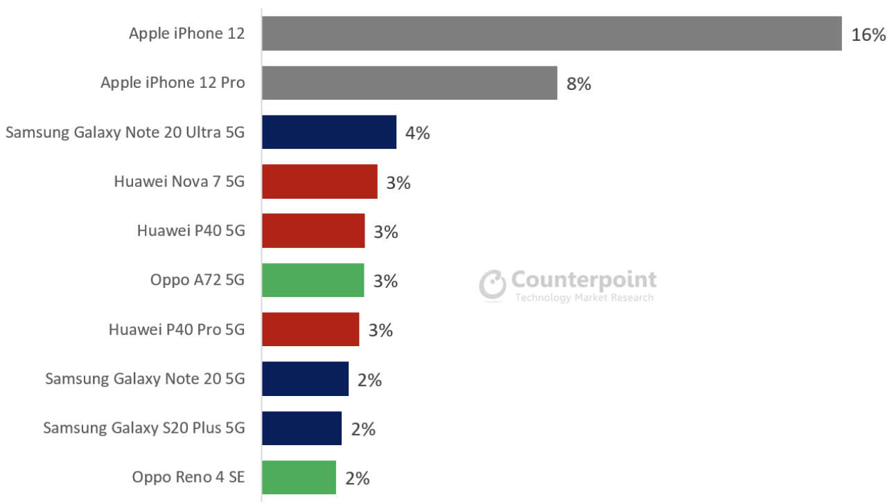 Ranking pokazuje udział w sprzedaży poszczególnych smartfonów 5G. Dane pochodzą od początku roku do października 2020. I to właśnie w tym październiku pojawiły się smartfony Apple!