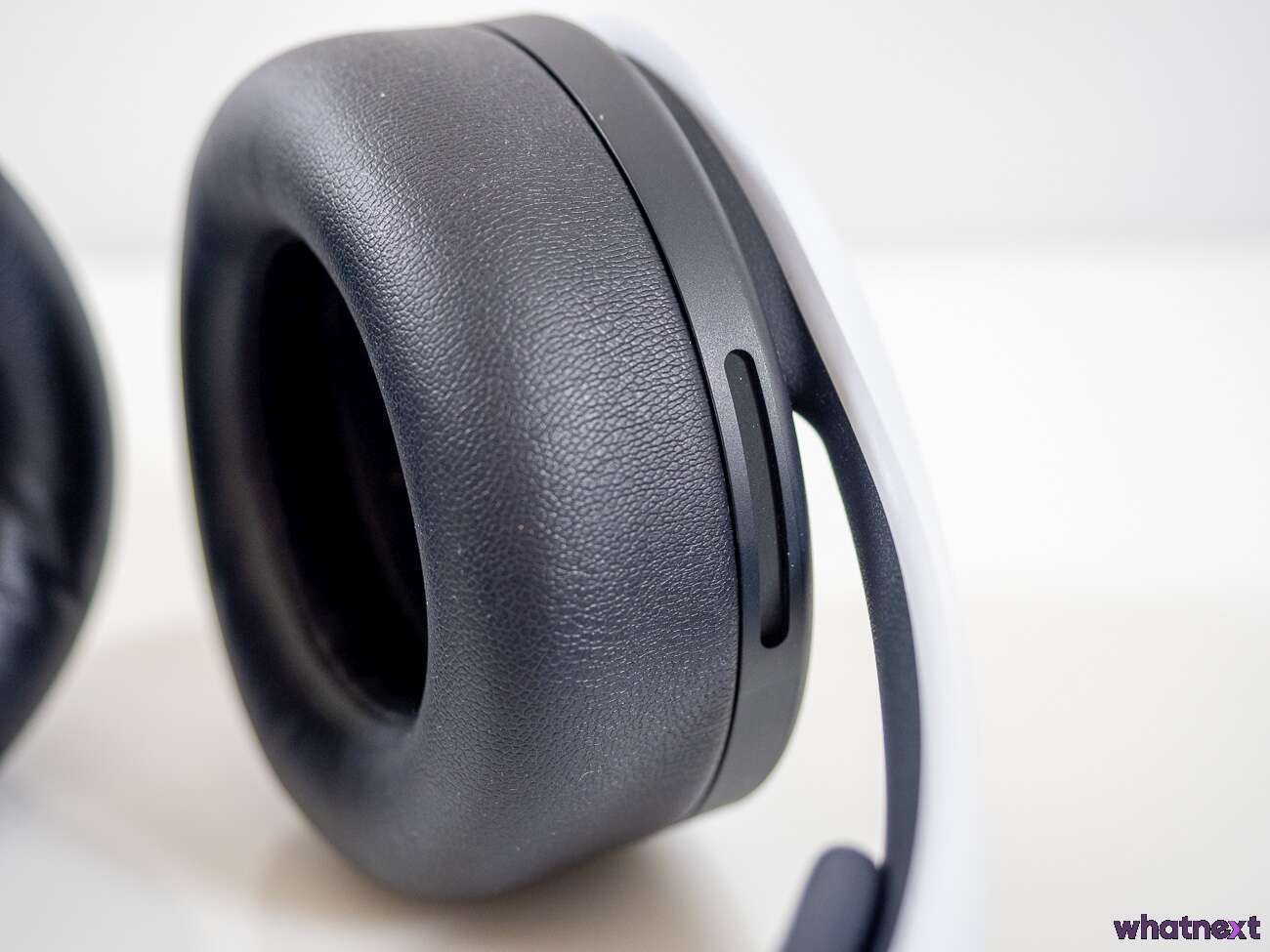 Obok tego mamy spory kontrast. Pałąk od spodu jest pokryty skóropodobnym materiałem. Podobnie jak nauszniki. Są grube, miękkie i oba te elementy robią już dla odmiany bardzo pozytywne wrażenie. Póki nie zajrzymy do nauszników. Tam trafimy na materiałową maskownicę, a pod nią bardzo twardy plastik. A może tak… kawałek gąbki?