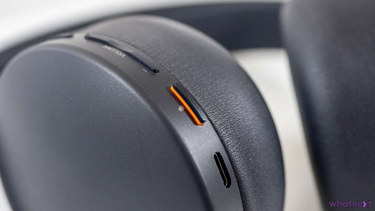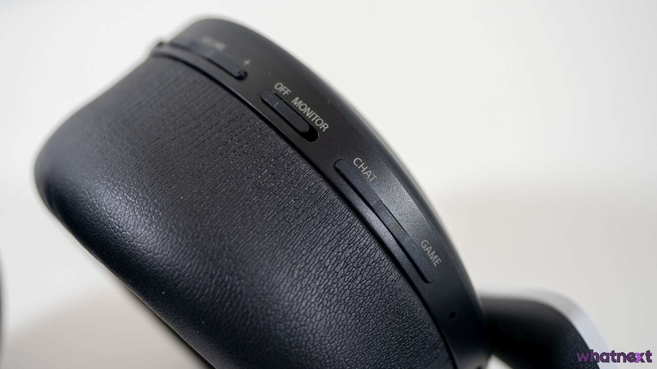 Pozostając przy ergonomii, należy wspomnieć o sterowaniu. Wszystkie elementy zostały umieszczone na lewej słuchawek. Idąc od dołu jest to suwak włącznika, gniazdo Jack 3,5mm, port USB-C, przycisk wyciszenia mikrofonu (przycisk… wyskakujący?), regulacja głośności, suwak funkcji Monitor oraz przycisk do przełączania się pomiędzy odgłosami gry i chatu.