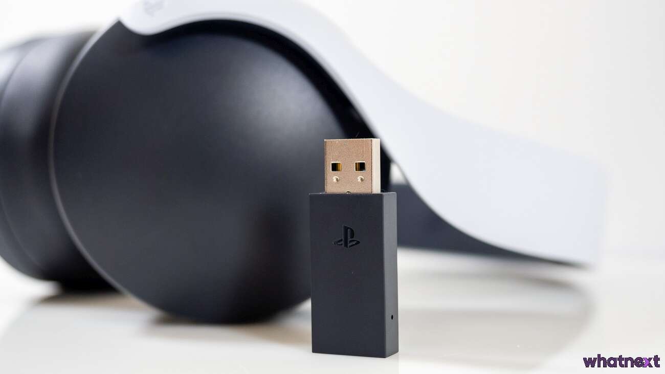 Wróć… zanim słuchawki zaczną grać, trzeba je podłączyć. Byłem w zasadzie pewny, że wystarczy je sparować z konsolą, ale potrzebujemy do tego dodatkowego odbiornika wpinanego do portu USB. Tych w PlayStation 5 nie brakuje, więc nie stanowi to problemu. W taki sam sposób możemy też podpiąć słuchawki do komputera.