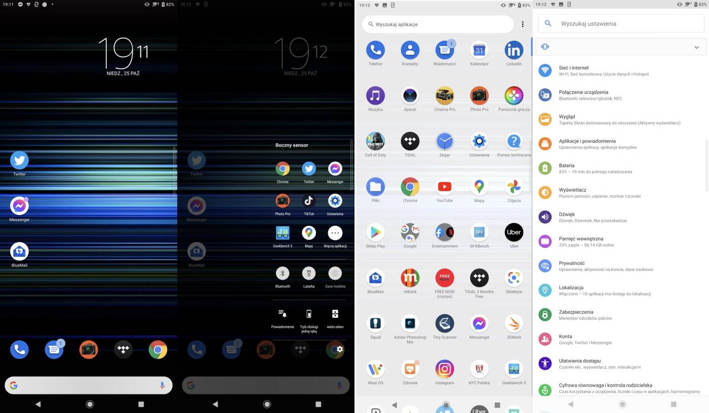 Smartfony Sony nie tylko z zewnątrz są nie do pomylenia z żadną inną marką. To samo tyczy się interfejsu. Ikony, styl poszczególnych ustawień, czy też tapety przechodzą bardzo kosmetyczne zmiany… od kilku lat. Przydałyby się w końcu jakieś większe zmiany, bo patrząc na Xperię 5 II mam wrażenie, że interfejs Xperii z serii Z wyglądał niemal identycznie. Za największą nowość można uznać pasek boczny, na którym możemy umieścić skróty do wybranych aplikacji lub akcji. Np. uruchamiania programów na podzielonym ekranie.